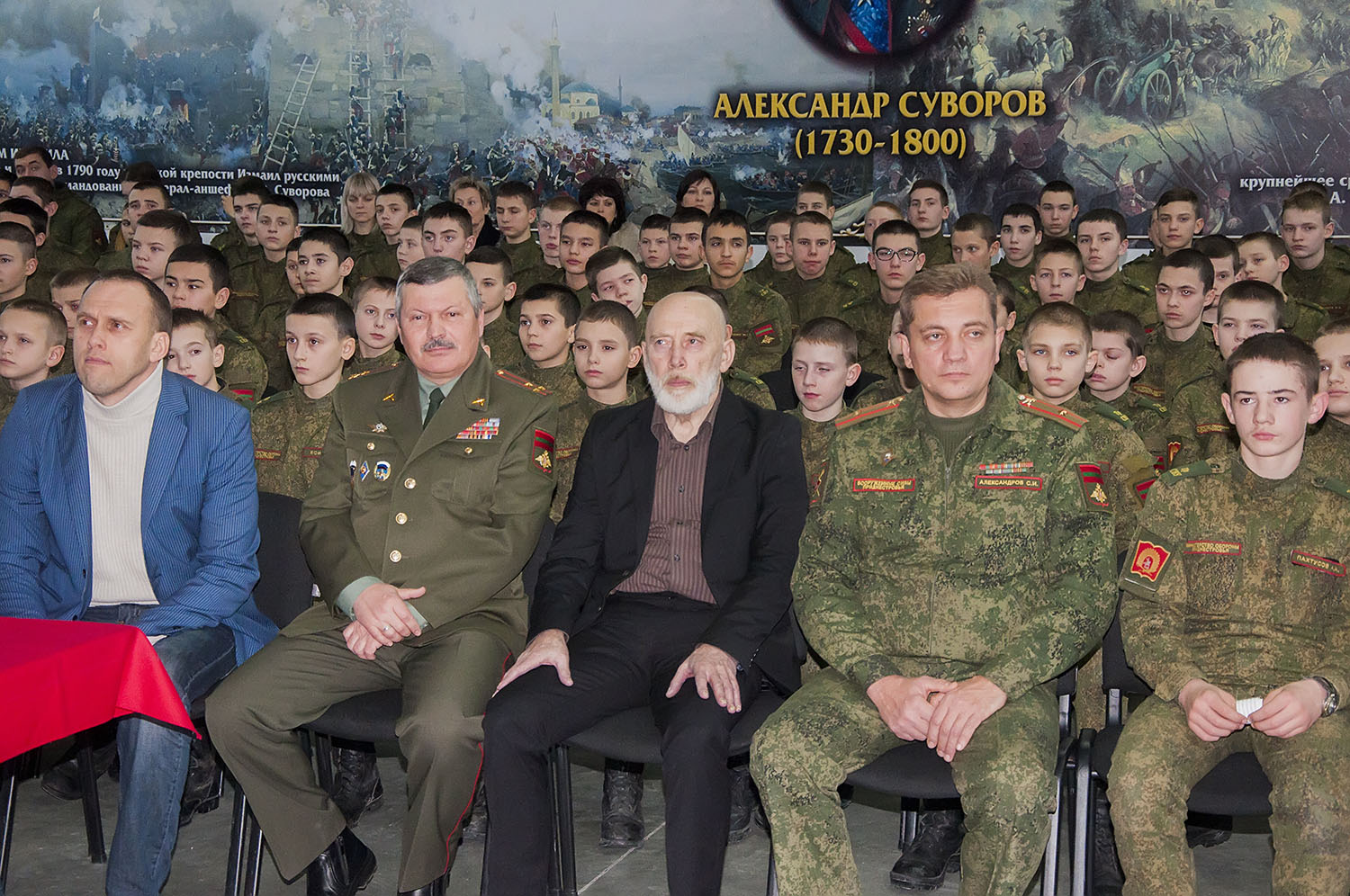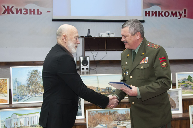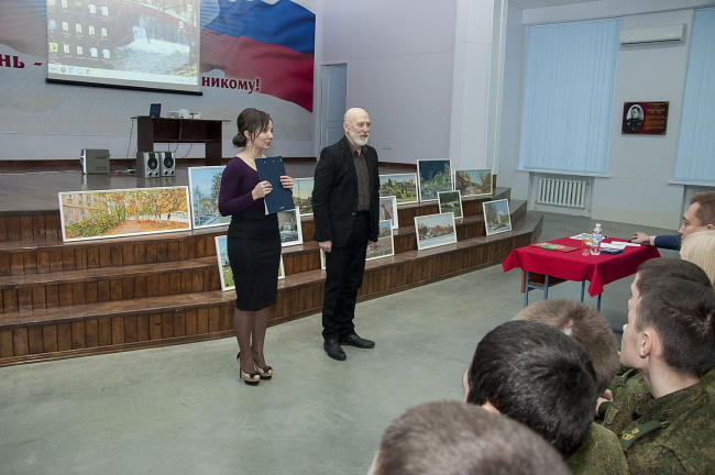 Владимир Николаевич окончил суворовское училище 50 лет назад. Он поделился с ребятами воспоминаниями об учебе и рассказал о том, какую роль Суворовское училище сыграло в его становлении как личности. Его достижения говорят сами за себя. Он мастер спорта по легкой атлетике, художник, поэт, отличный работник искусств. Здесь же, в стенах Суворовского училища, развернулась мини-выставка с работами художника.