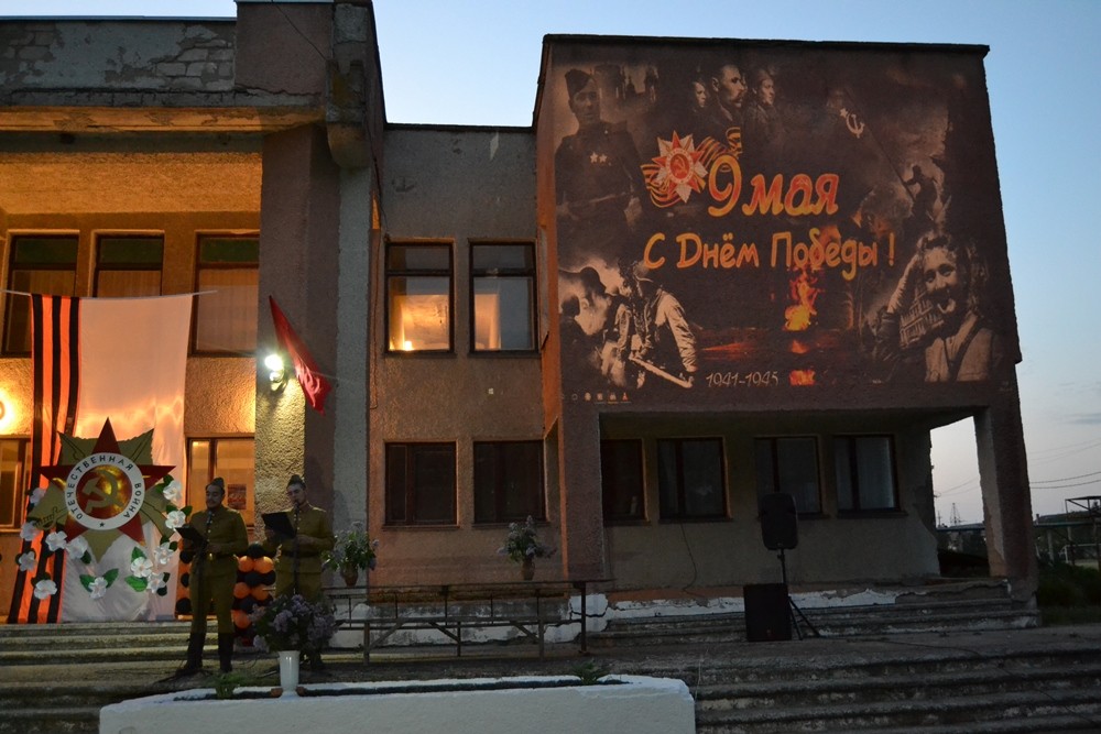 В преддверии Дня Победы на сцене ДК выступили местные коллективы. На протяжении всего концерта звучали песни военных лет, одновременно на фасаде здания демонстрировалась хроника Великой Отечественной войны.