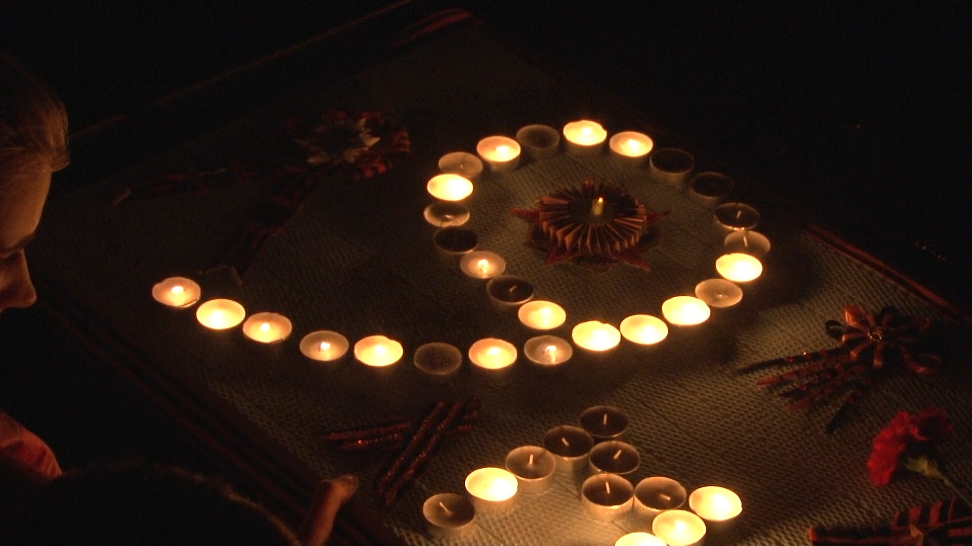 Участники акции выложили надпись «9 Мая» свечами, которую опустили в лодку, плывущую по озеру. Кроме этого, каждый из участников зажёг свечу и выпустил в небо шар в память о Великой Победе.