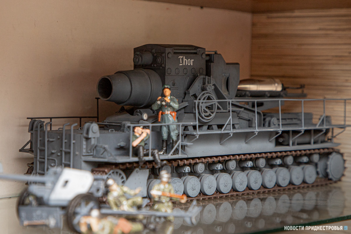 Кстати, самая маленькая и самая большая модели как раз из вражеских. Представьте, мотоцикл, у которого спереди колесо, а сзади гусеница. Такое чудо техники выпускалось в годы войны фирмой NSU. Не совсем, конечно, бронетехника, но этот «кентавр» был достаточно распространён в немецких частях. С другой стороны – самоходная мортира «Карл» калибром 600 миллиметров и массой в 126 тонн. Расход топлива у этой махины был такой, что она сожрала бы 1200 литров горючего, двигаясь самостоятельно, например, от Кишинёва до Бендер. Каждый из семи выпущенных «карлов» имел имя собственное: «Адам», «Ева», «Один» и т. д. Миниатюрная копия в коллекции Валерия – это «Тор». Он вместе с тремя вышеназванными орудиями этого типа обстреливал Брестскую крепость и Севастополь. Конкретно «Тор» был уничтожен авиацией союзников в 1944 году.