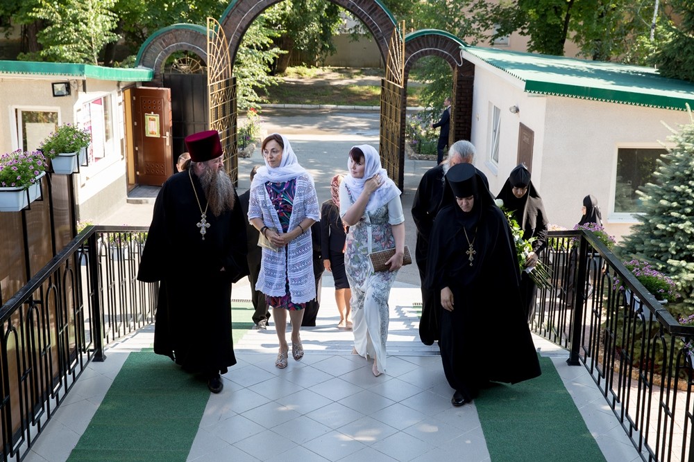 Бендеры, 6 июля. /ИА «Новости Приднестровья»/. Супруга вице-премьера РФ Татьяна Рогозина в сопровождении первой леди Приднестровья Нины Шевчук посетили Петропавловский женский монастырь в Бендерах. Для гостей настоятельницы провели экскурсию по монастырю, рассказали о жизни послушниц и истории главных святынь.