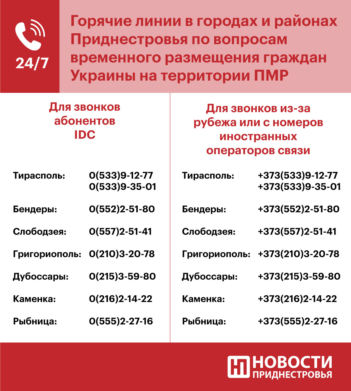 Также по решению Оперативного штаба по оказанию содействия иностранным гражданам, вынужденным временно находиться на территории ПМР, работа горячих линий была организована в Тирасполе, Бендерах, Слободзее, Григориополе, Дубоссарах, Рыбнице и Каменке на базе территориальных кризисных центров при ОВД.