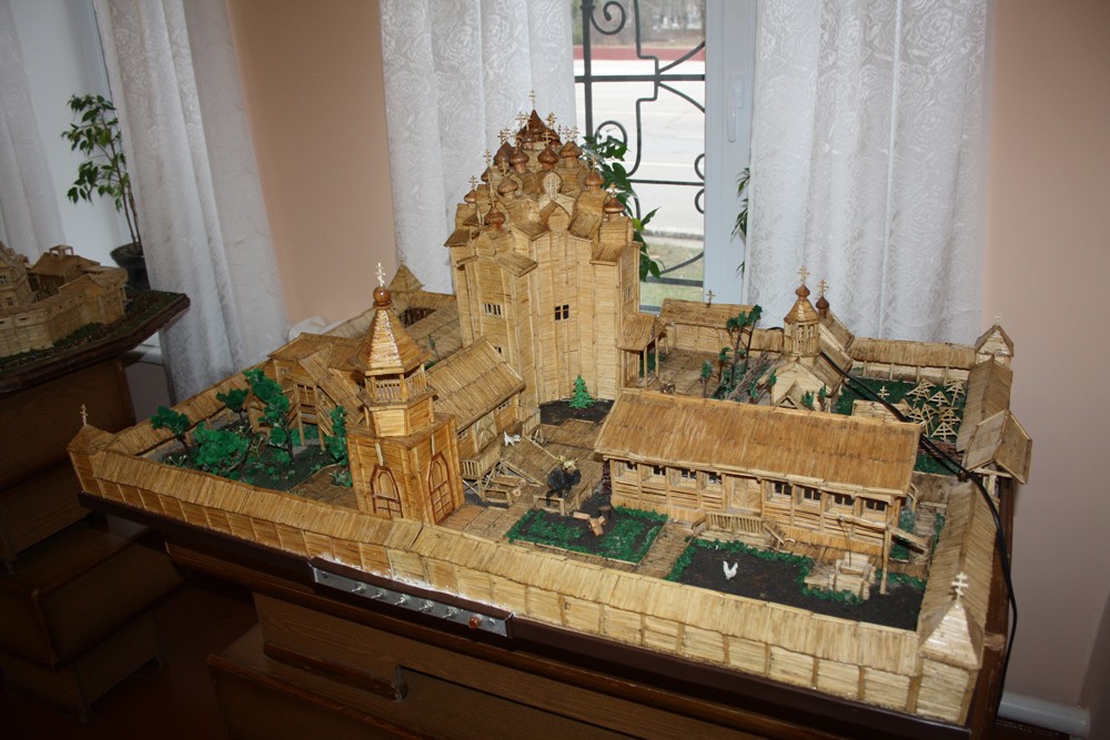В коллекции Владимира — макет всемирно известного архитектурного ансамбля «Погост Кижи»: храм, хозяйственные постройки, склады, дома для священнослужителей, церкви, часовню, дом для настоятеля храма, единую ограду. В окнах строений даже зажигается импровизированный свет. На эту уникальную конструкцию из спичек у автора ушло четыре года.