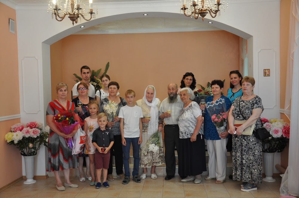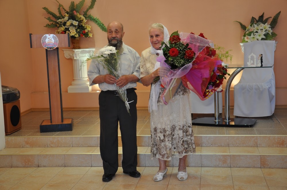 В честь золотого юбилея – 50-летия совместной жизни – Олег Габужа вручил виновникам торжества ценный подарок и цветы. Затем звучали поздравления от родных, близких и друзей. Завершением церемонии стало общее семейное фото.