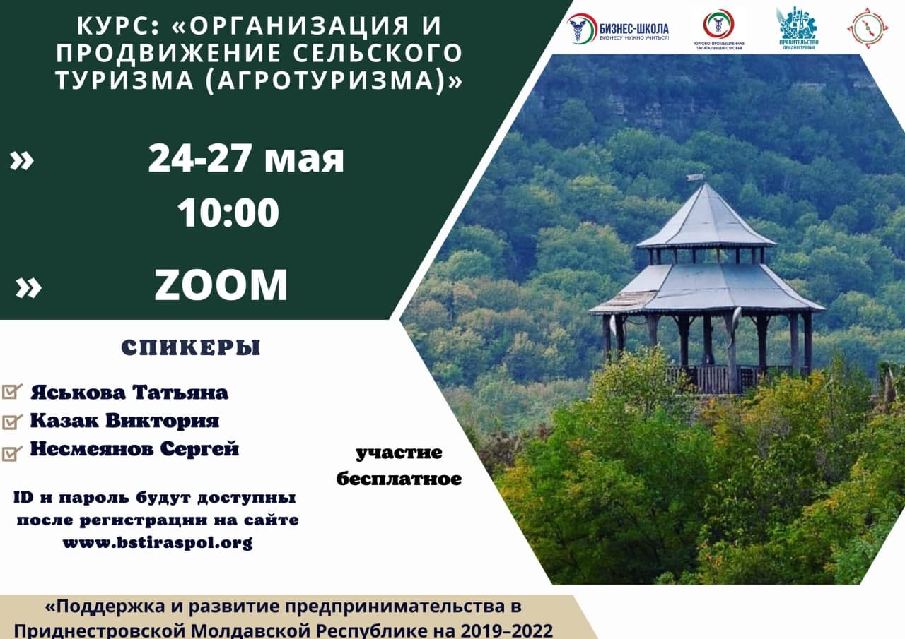 Тирасполь, 6 мая. /Новости Приднестровья/. С 24 по 27 мая нынешнего года бизнес-школа Торгово-промышленной палаты ПМР организует обучение по курсу «Организация и продвижение сельского туризма (агротуризма)». Как сообщается на сайте ТПП ПМР, обучение будет проходить удаленно, на платформе ZOOM.