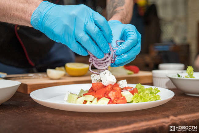 Молодой человек провёл для школьников инструктаж по поведению на кухне, а затем показал мастер-класс по приготовлению салата.