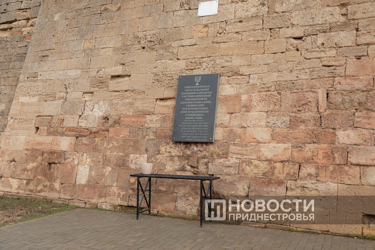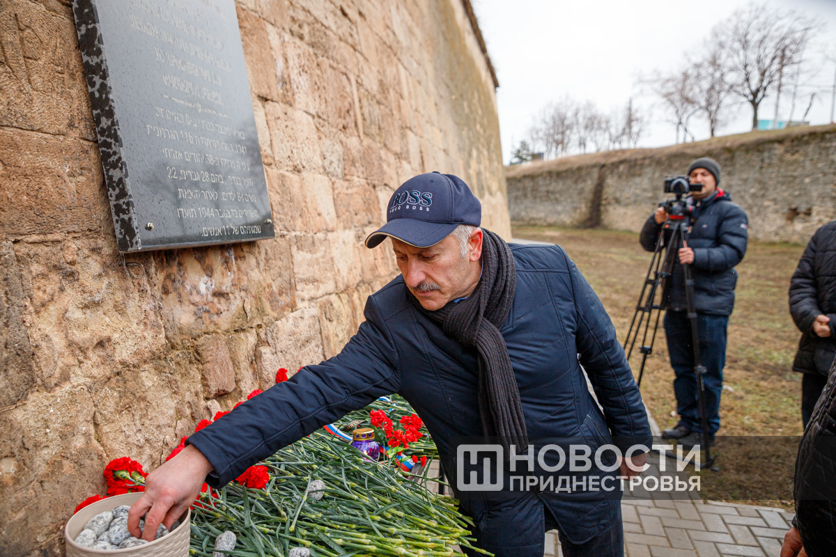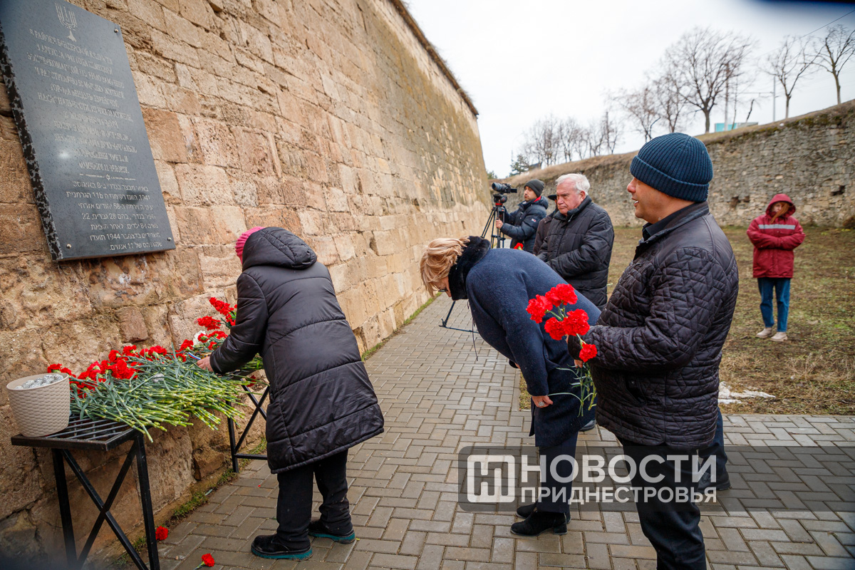После поминальной молитвы «Кадиш» участники митинга положили к подножию мемориала живые цветы. Красные гвоздики и розы появились сегодня и у памятного знака во рву Бендерской крепости, в одном из мест массовых казней евреев. А поверх них положили небольшие камни как символ вечности и надежды на память.