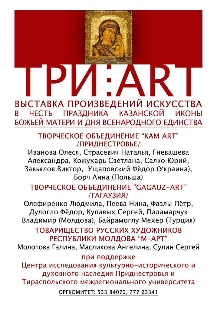 Проректор ТМУ Николай Дымченко отметил то, что выставка открывается в канун православного праздника Казанской иконы Божией Матери и Дня народного единства, очень символично, т.к. она объединяет три творческих объединения, представленные русскими, молдавскими, украинскими, гагаузскими художниками.