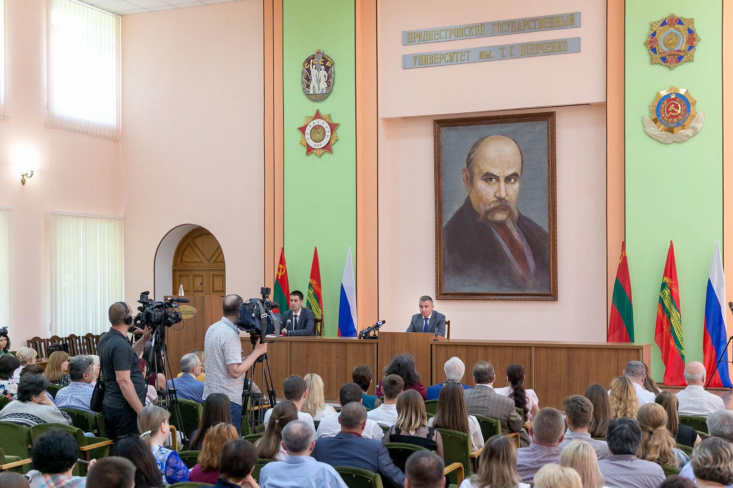 23 Май., 2019, 20:06Тирасполь, 23 мая. /Новости Приднестровья/. Президент ПМР Вадим Красносельский встретился с профессорско-преподавательским составом и студентами Приднестровского госуниверситета им. Т. Г. Шевченко.