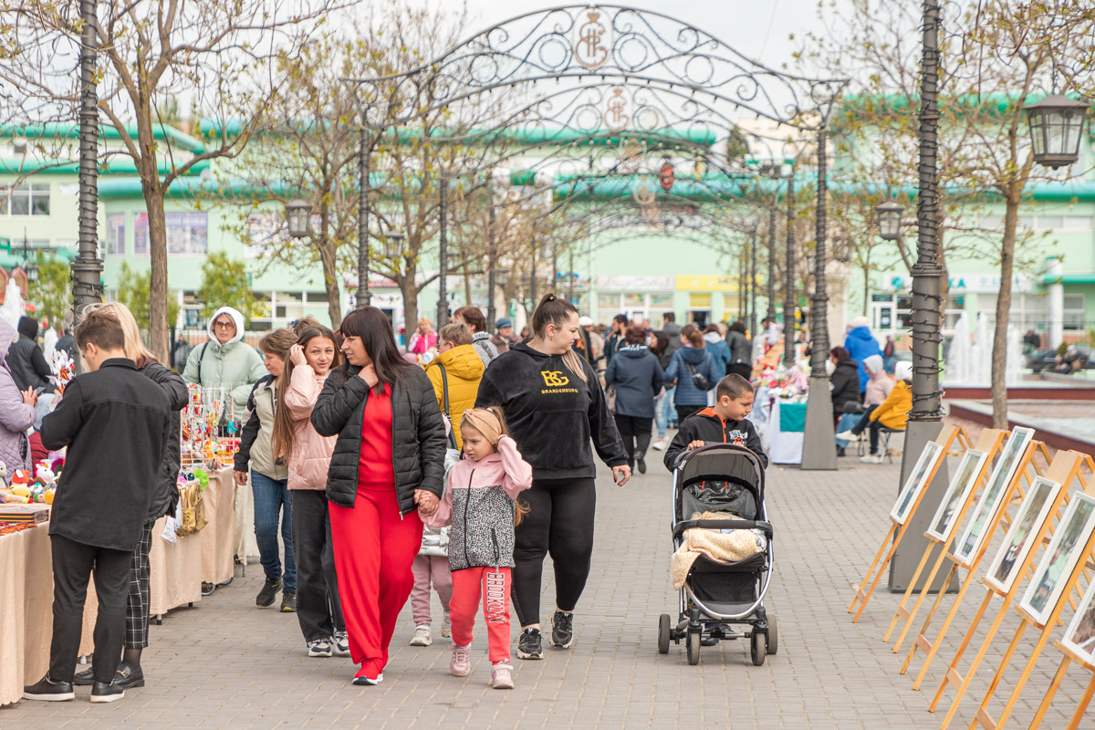 Прохожие рассматривают сувениры. Глаза разбегаются от изобилия различных предметов. Деревянные, тканевые и глиняные – и всё это ручная работа.