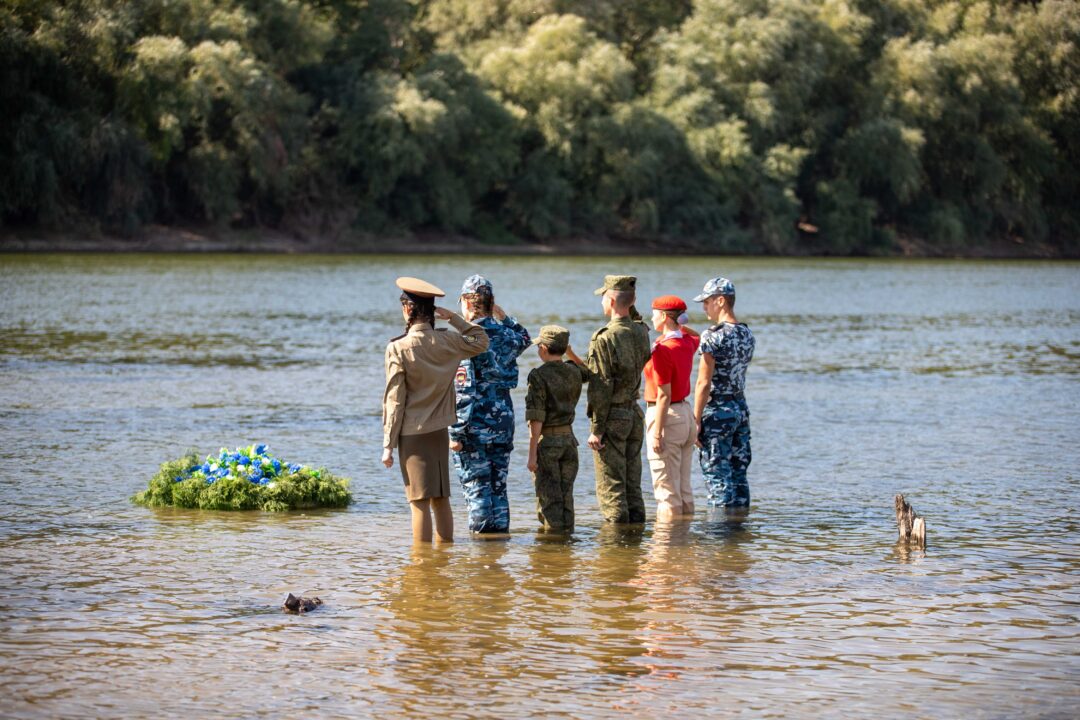 Сегодня участники тематического мероприятия спустили на воду венок. У монумента были организованы фотозоны и выставка исторического оружия, которую подготовили представители общественной организации «Наследники Побед».