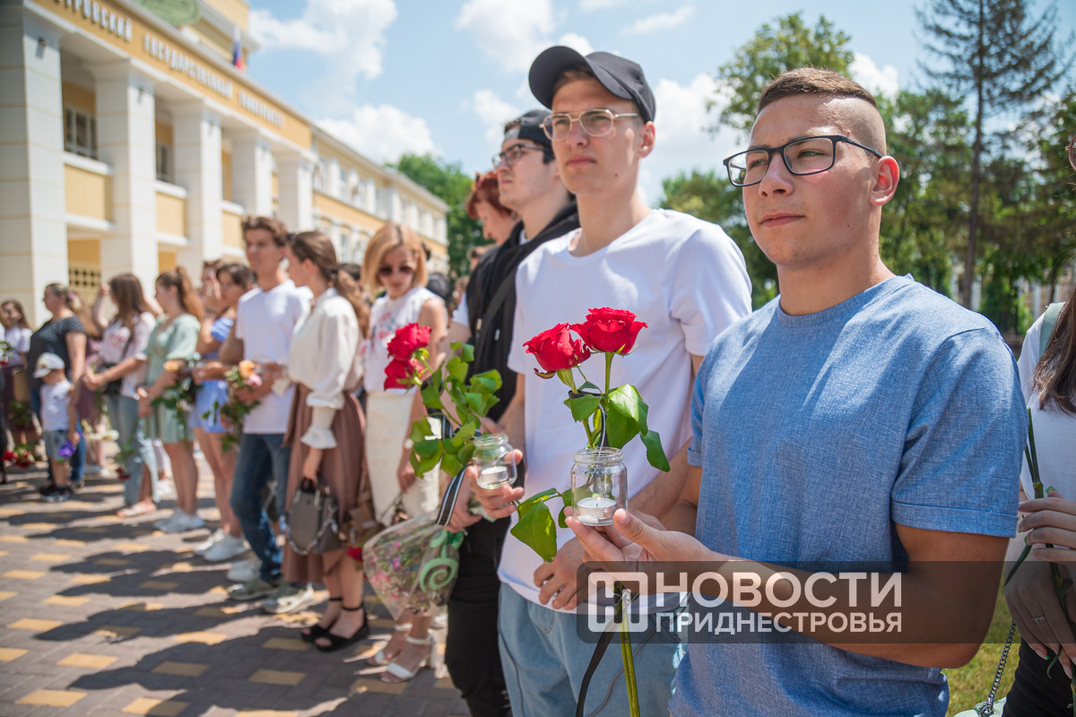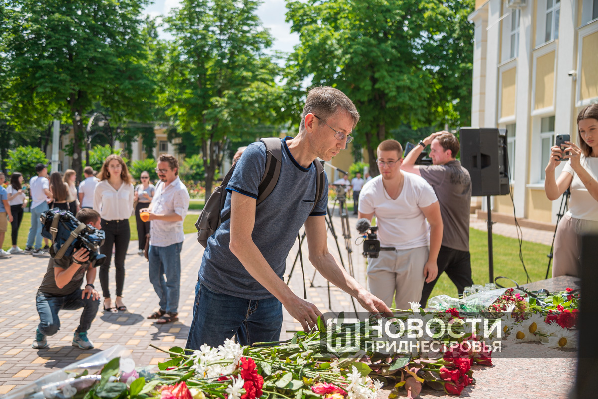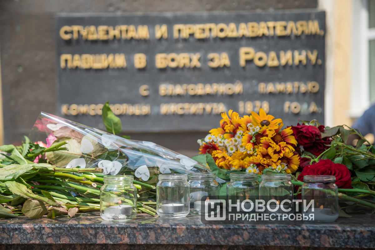 Митинг провели в Тирасполе у главного корпуса Приднестровского госуниверситета. Неподалёку от входа находится монумент, его установили здесь 45 лет назад. Это память о 30 студентах и 2 преподавателях, добровольно ушедших на фронт и погибших там.