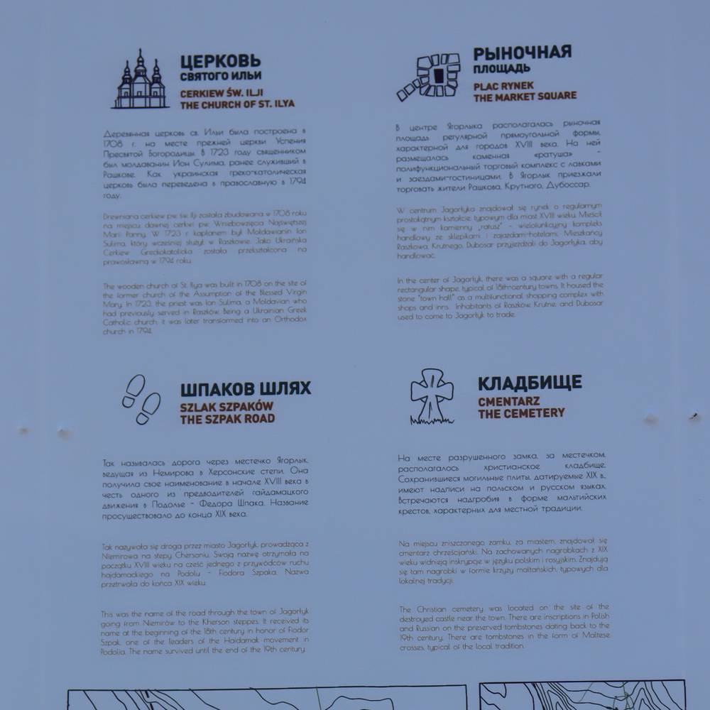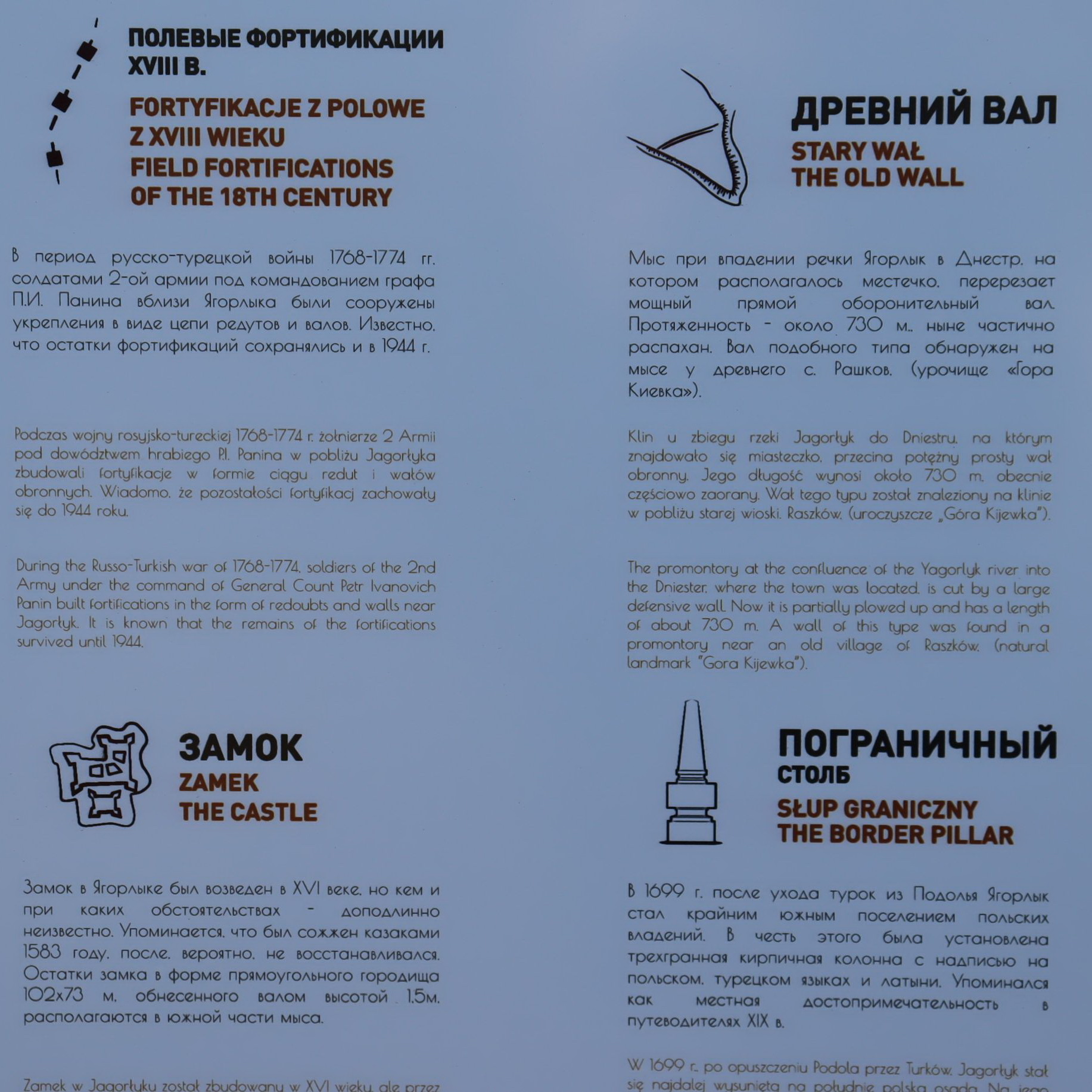 На стенде представлена информация на трех языках: русском, польском и английском. Здесь можно узнать об интересных событиях и значимых местах Ягорлыка: о Шпаковом пути, о рыночной площади, о старинных замках и кладбищах, о полевых фортификациях XVIII века. Особый интерес у польских представителей вызывает период истории, связанный с Речью Посполитой.