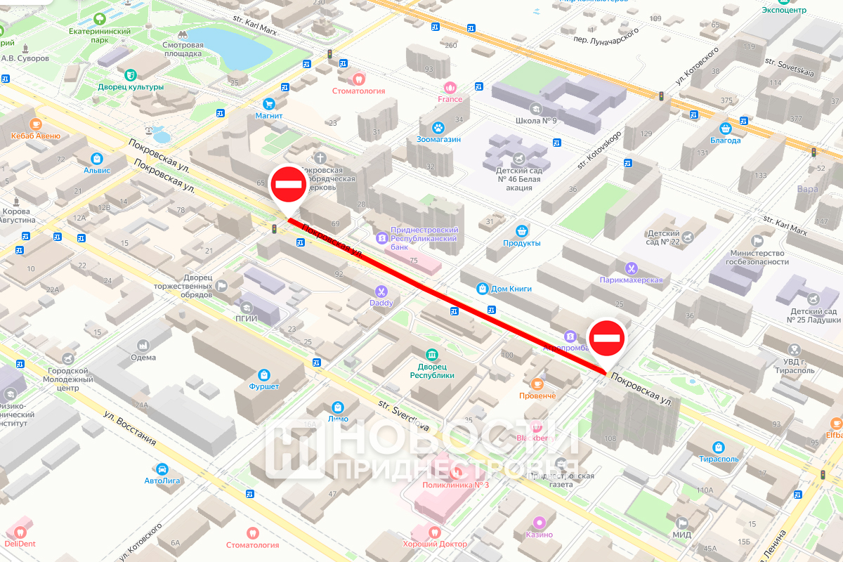 Тирасполь, 15 мая. /Новости Приднестровья/. В Тирасполе с 16 мая частично перекроют движение на участке улицы Покровской (25 Октября) от Манойлова (магазин «Тимп») до Луначарского («Хайтек»). Там будут проводиться ремонтные работы, сообщает пресс-центр МВД ПМР.