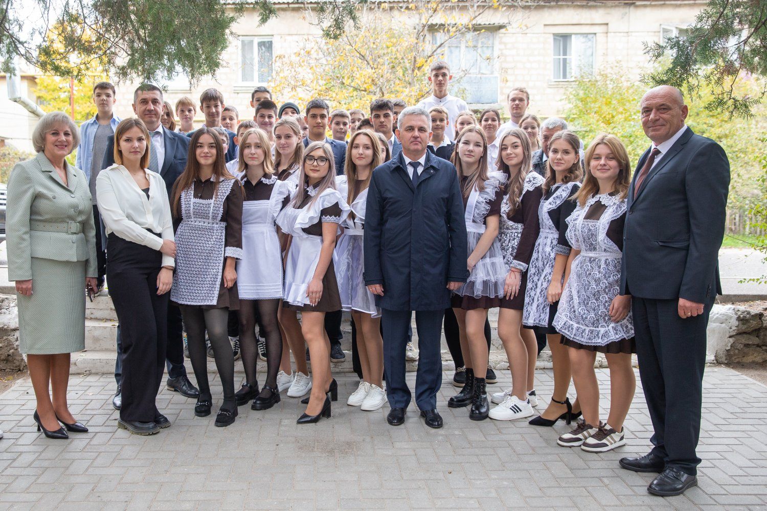 Выпускники, узнав о визите Президента ПМР, попросили о встрече, чтобы поблагодарить за долгожданное оснащение компьютерного класса. На память об этой встрече - фотография с главой государства. На фото попали и ученики помладше, которые повстречались Президенту у входа в школу.
