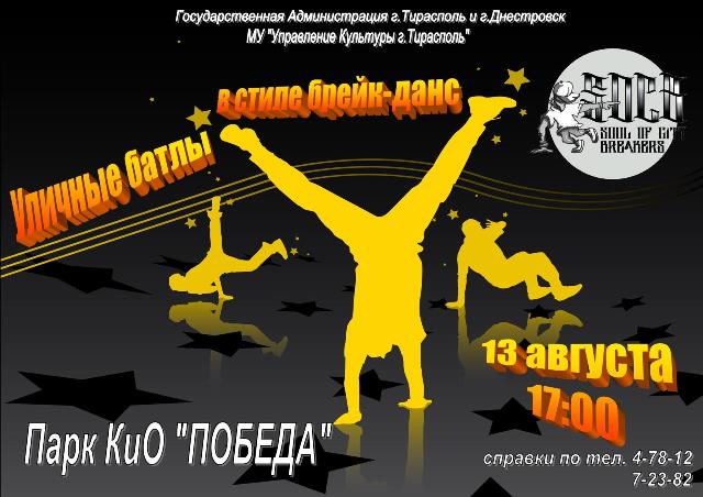 Тирасполь, 11 августа. /Новости Приднестровья/. По инициативе столичной госадминистрации и тираспольского Управления культуры в парке культуры и отдыха «Победа» пройдут батлы в стиле брейк-данс.
