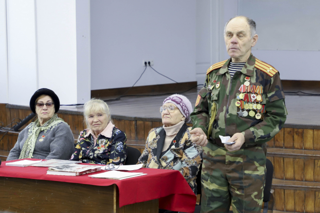 На встречу с учащимися Суворовского училища пригласили бывших узников фашистских концлагерей – Людмилу Божонку, Екатерину Малюту, Владимира Головашова и председателя Общества бывших узников фашизма Тирасполя Татьяну Поято.