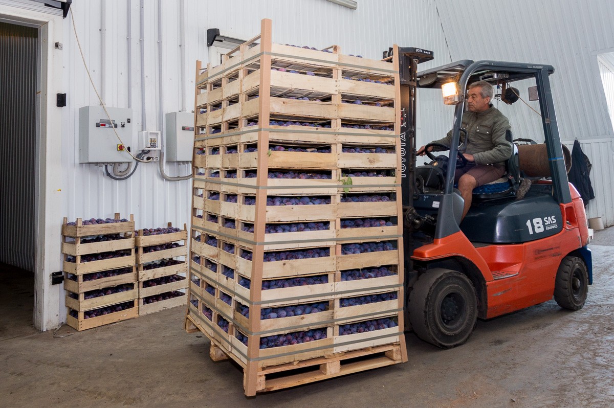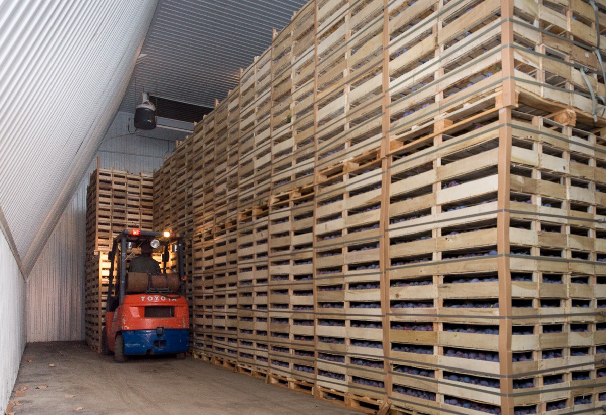 Непосредственно из сада продукция поступает в камеры предварительного охлаждения, и уже потом – в камеры на длительное хранение. В каждую камеру можно поместить до 200 тонн сливы, и здесь она может находиться до нескольких месяцев.