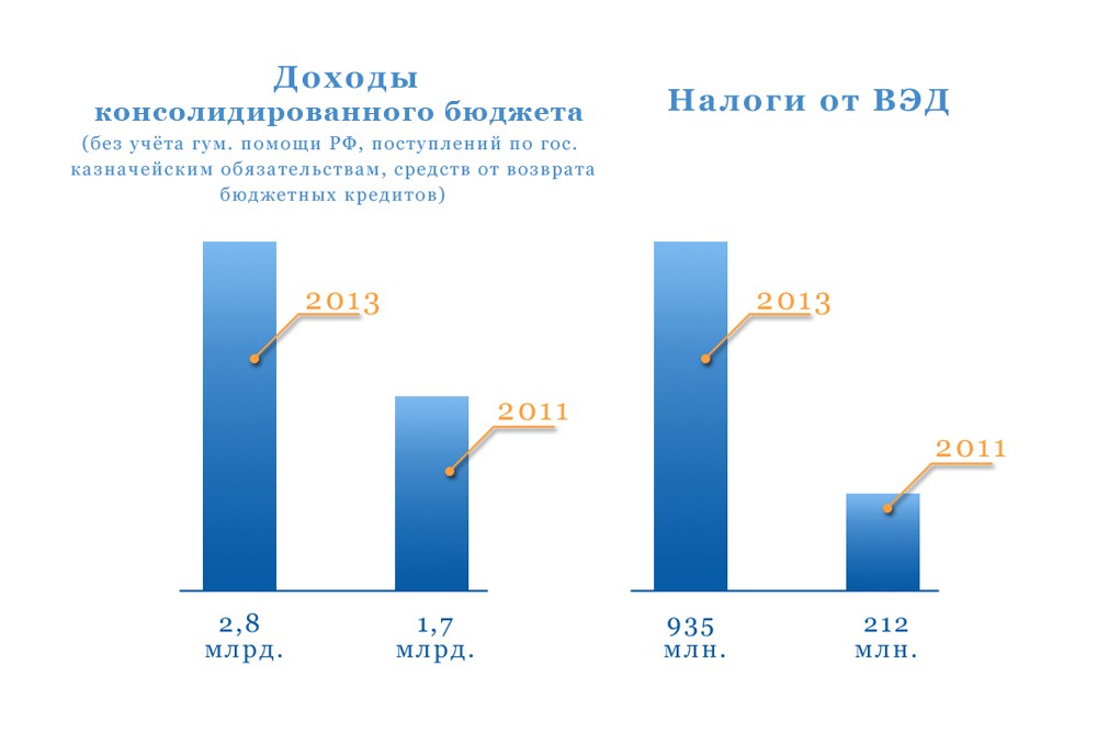 Поступления в госказну от внешнеэкономической деятельности (акцизы и таможенные сборы) выросли за 2 года в 4,5 раза с 212 млн до 935 млн рублей.