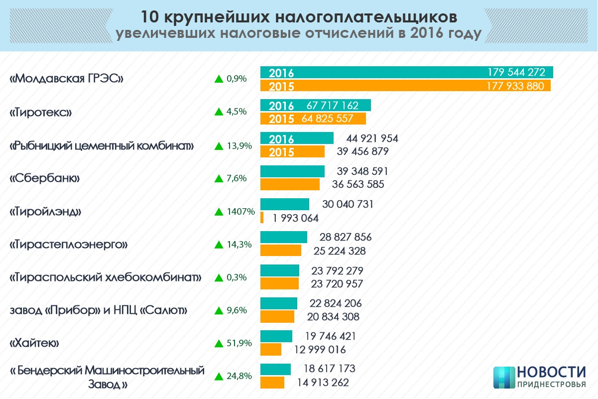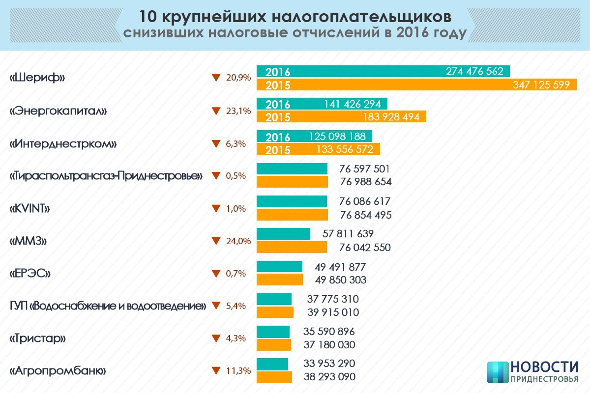В 2016 году 26 из 50 крупнейших налогоплательщиков Приднестровья сократили отчисления в бюджеты всех уровней. Спад уплаты налогов данными хозяйствующими субъектами по отношению к аналогичному периоду прошлого года составил 185,1 млн руб. (или 14,3%).