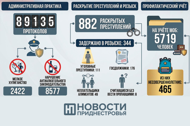 Всего в 2025 году подразделения МОБ раскрыли 882 преступления. Было задержано 344 человека, находившихся в розыске. Из них 111 - уголовные преступники, 176 - госдолжники, 49 - неплательщики алиментов, восемь – считавшиеся без вести пропавшими. На специальном профилактическом учёте МОБ состоят 5 719 человек, из которых 465 – несовершеннолетние.