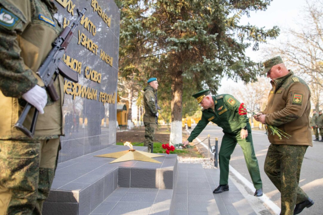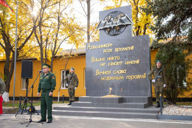 Год назад на территории воинской части открыли Мемориал разведчикам всех времён. В память о подвигах разведчиков у его подножия горит вечный огонь, зажжённый на столичном Мемориале Cлавы. Сегодня память погибших защитников почтили минутой молчания.