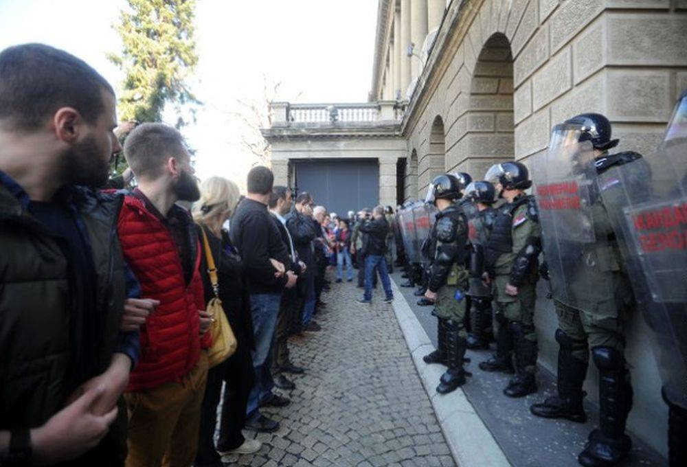 Ранее свыше тысячи протестующих собрались перед президентской резиденцией в центре города. После начала пресс-конференции Александра Вучича около 12:00 мск вокруг резиденции начался шум, участники протеста прорвались через внешние ограждения и блокировали входы в здание. Служба безопасности не пускает их внутрь.