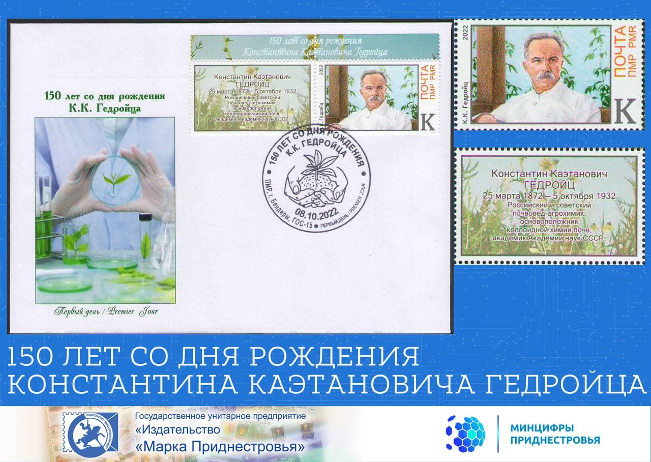 Бендеры, 7 октября. /Новости Приднестровья/. 8 октября в Бендерском историко-краеведческом музее состоится презентация и спецгашение новой серии почтовых марок от ГУП «Издательство "Марка Приднестровья"» «150 лет со дня рождения Константина Каэтановича Гедройца». Почтовый выпуск посвящённый великому советскому учёному родом из Приднестровья.