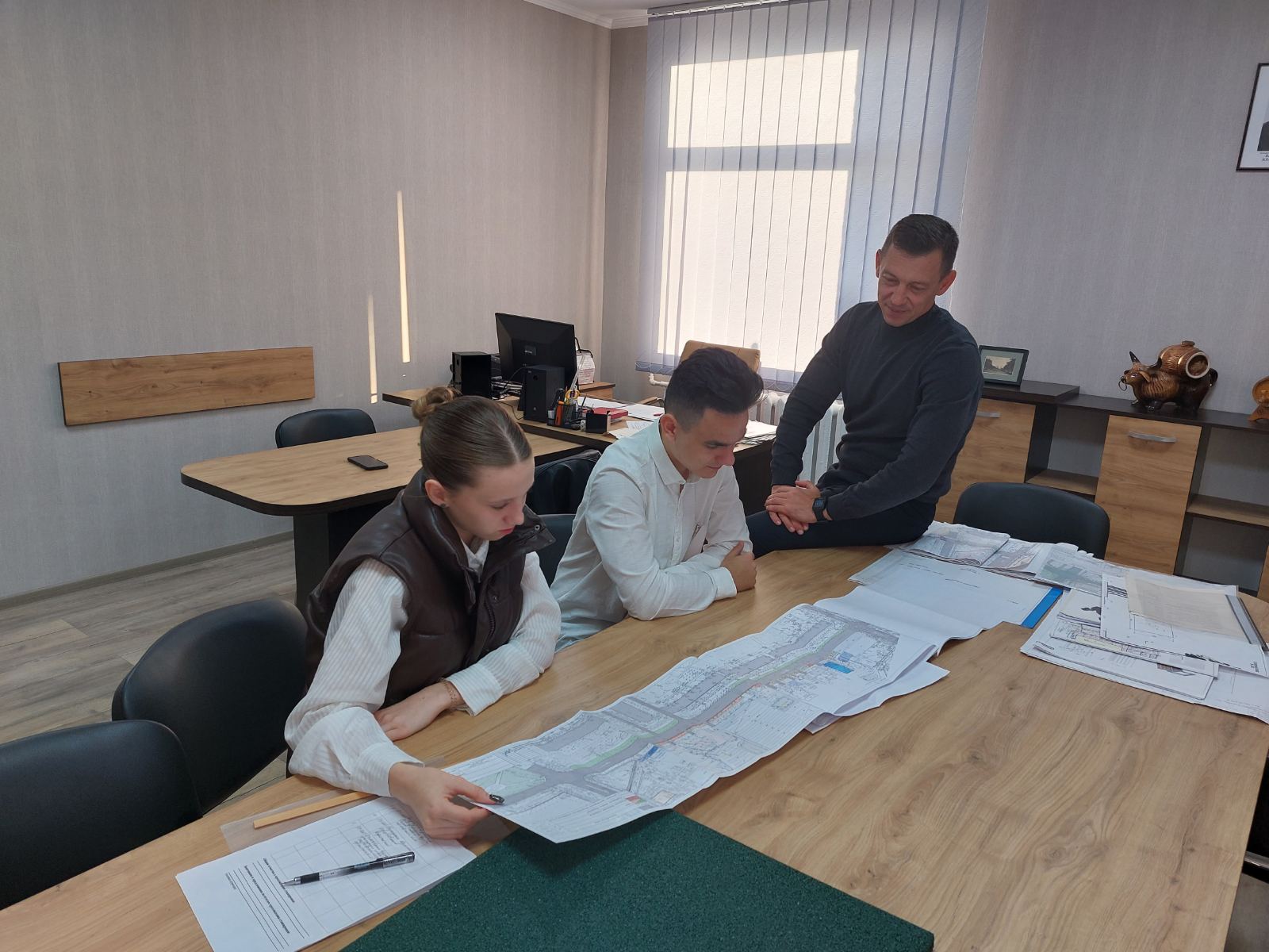 Замглавы по вопросам архитектуры и градостроительства Андрей Диордиев со своим дублером рассмотрели план реконструкции улицы Советской. Главный архитектор города в это время показывал своему дублеру эскизный вариант решения благоустройства участка улицы.