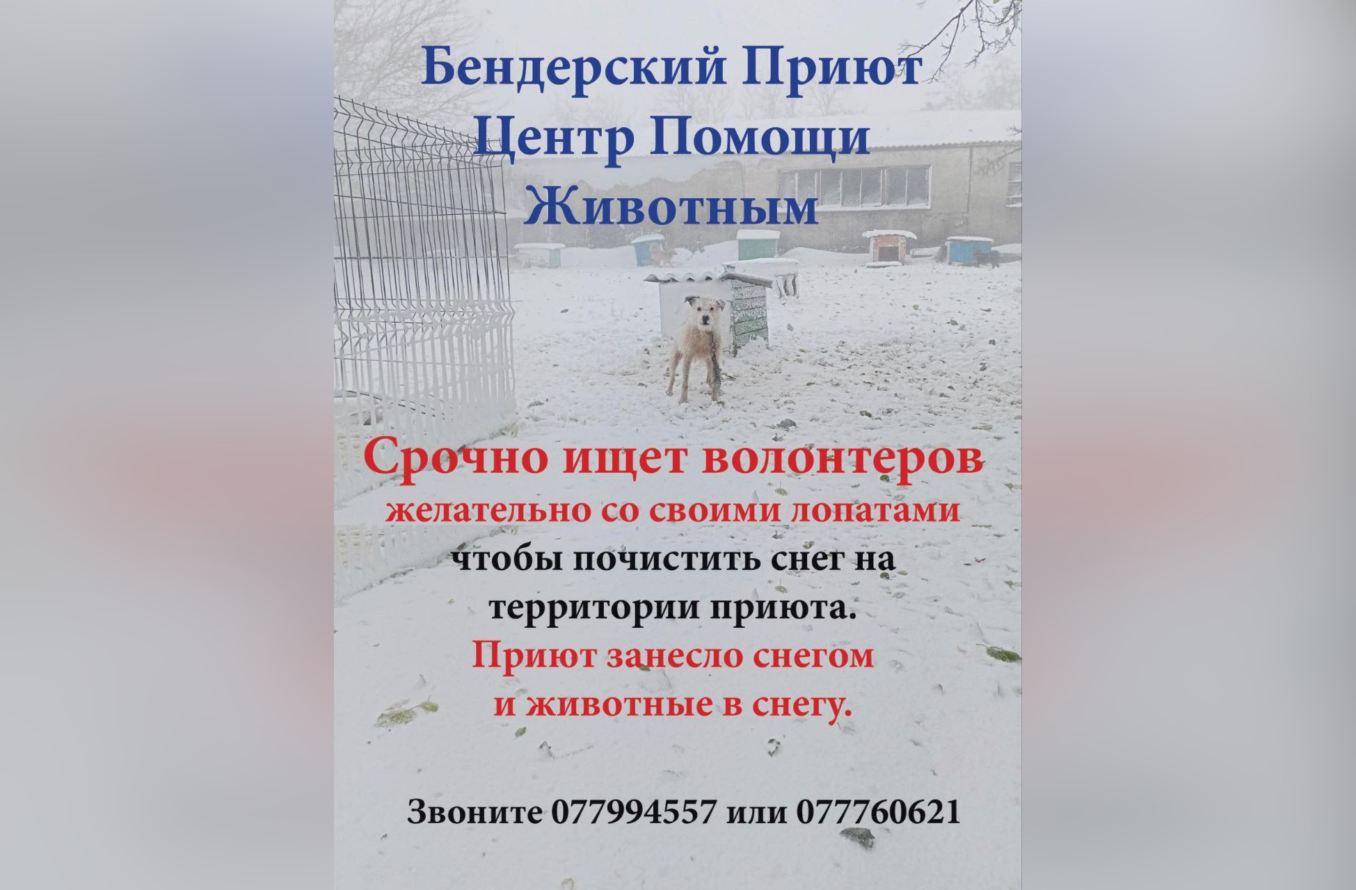 Как сообщил телеграм-канал «Волонтеры Приднестровья», приюту нужны добровольцы и рабочие для расчистки снега. Кроме того, необходимо закрепить шторы на будки, заменить мокрую солому на сухую. Приют будет признателен за лопаты и перчатки для расчистки снега.