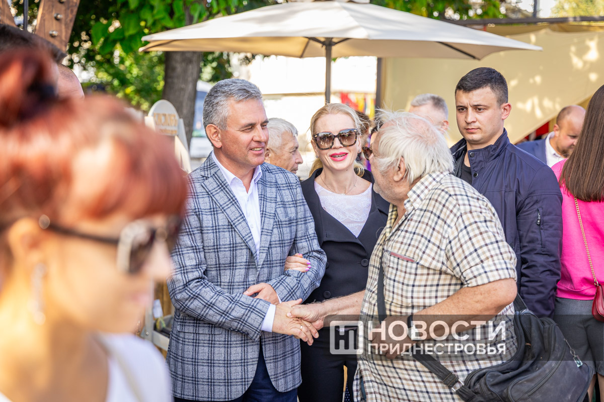 На нижней террасе парка «Октябрьский» прошел велопробег и легкоатлетический забег, на улице Ткаченко выступали фольклорные коллективы, шумели национальные подворья. Их посетил Президент ПМР Вадим Красносельский с супругой Светланой.