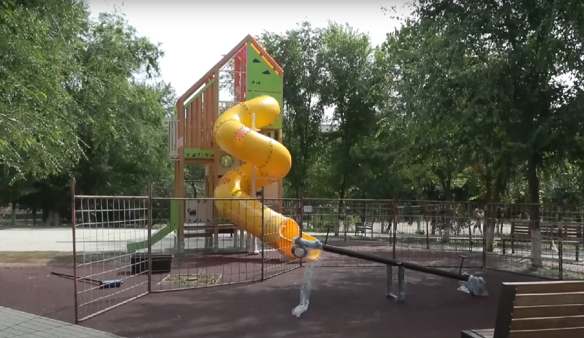 Уже установили двухъярусный детский городок с горкой, скамейки и светильники