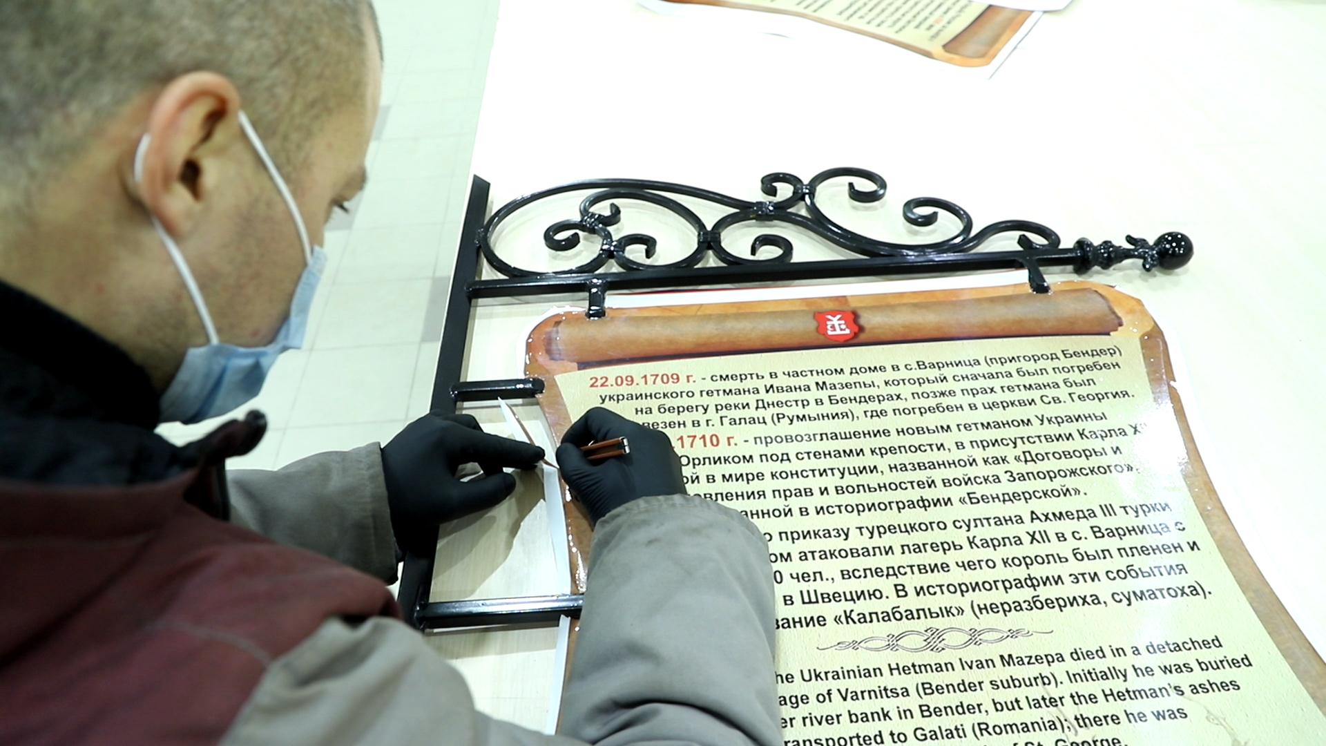 Макет свитков разработали специалисты исторического мемориального комплекса «Бендерская крепость». Кованая часть изделия изготовлена на тираспольской сувенирной фабрике «Лучафэрул». Распечаткой текстовой части и размещением ее на данную конструкцию занялись специалисты столичного рекламного агентства.