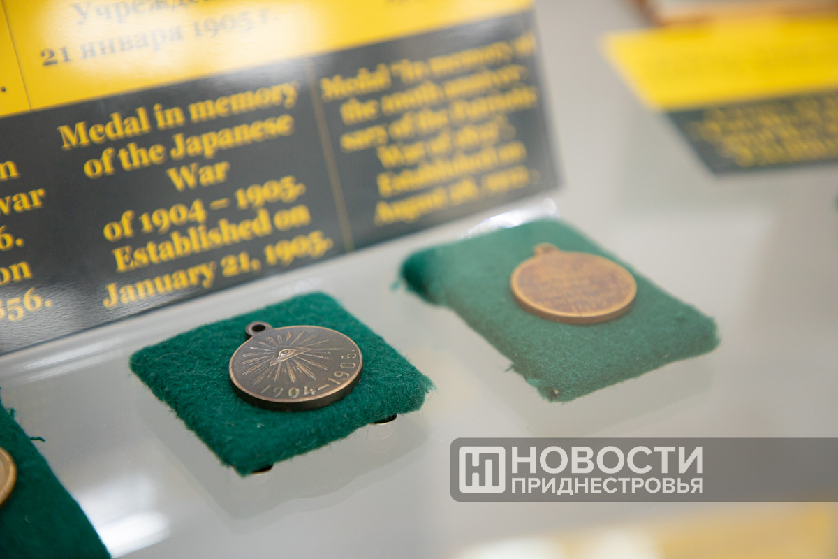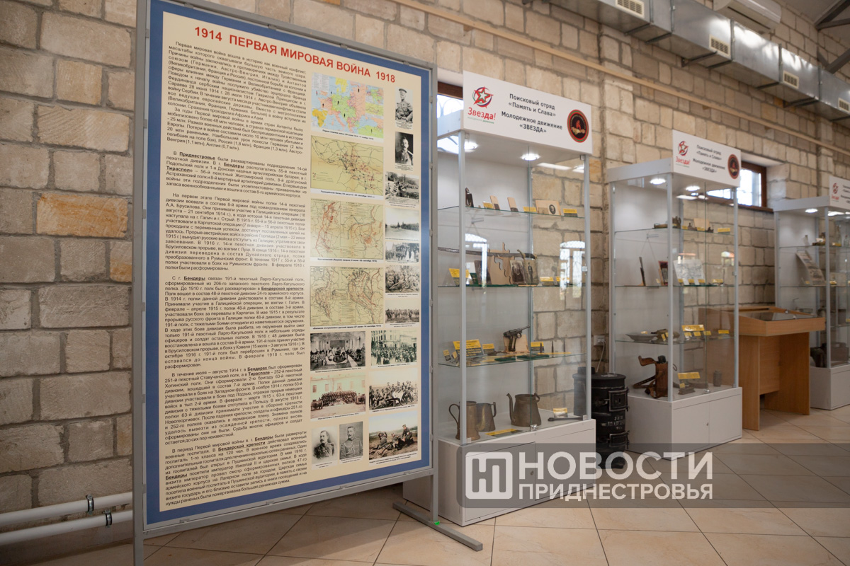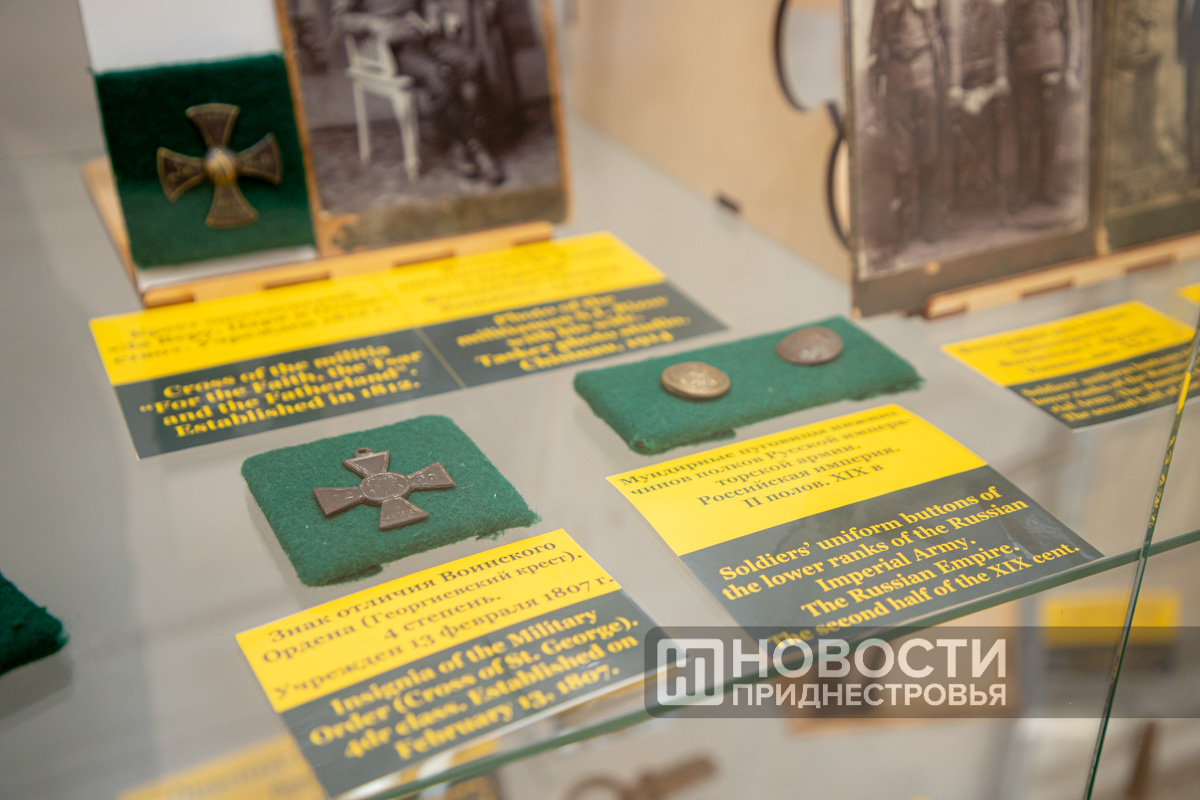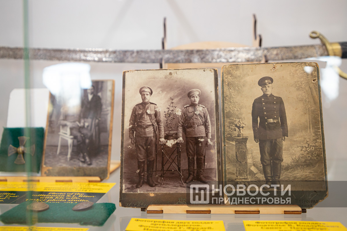 Один стенд и 4 витрины. Для удобства все предметы разделены по временным периодам. На стенде – краткая информация об участии полков из Приднестровского края в сражениях I мировой войны, в частности 14-й пехотной дивизии. Рядом – уже непосредственно экспонаты, относящиеся к той эпохе. Есть несколько фото из мирной жизни – документов работников железной дороги, перевозивших грузы из Бендер в Румынию. Ещё есть награды и нательные образа-иконки.