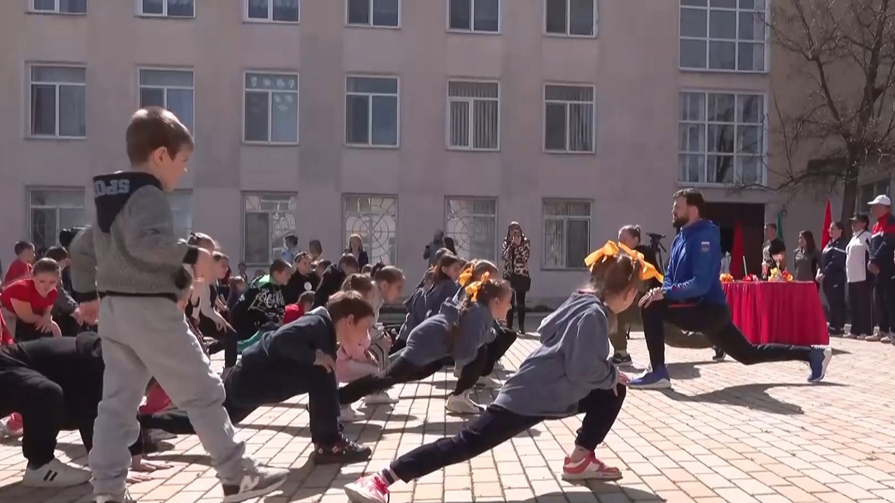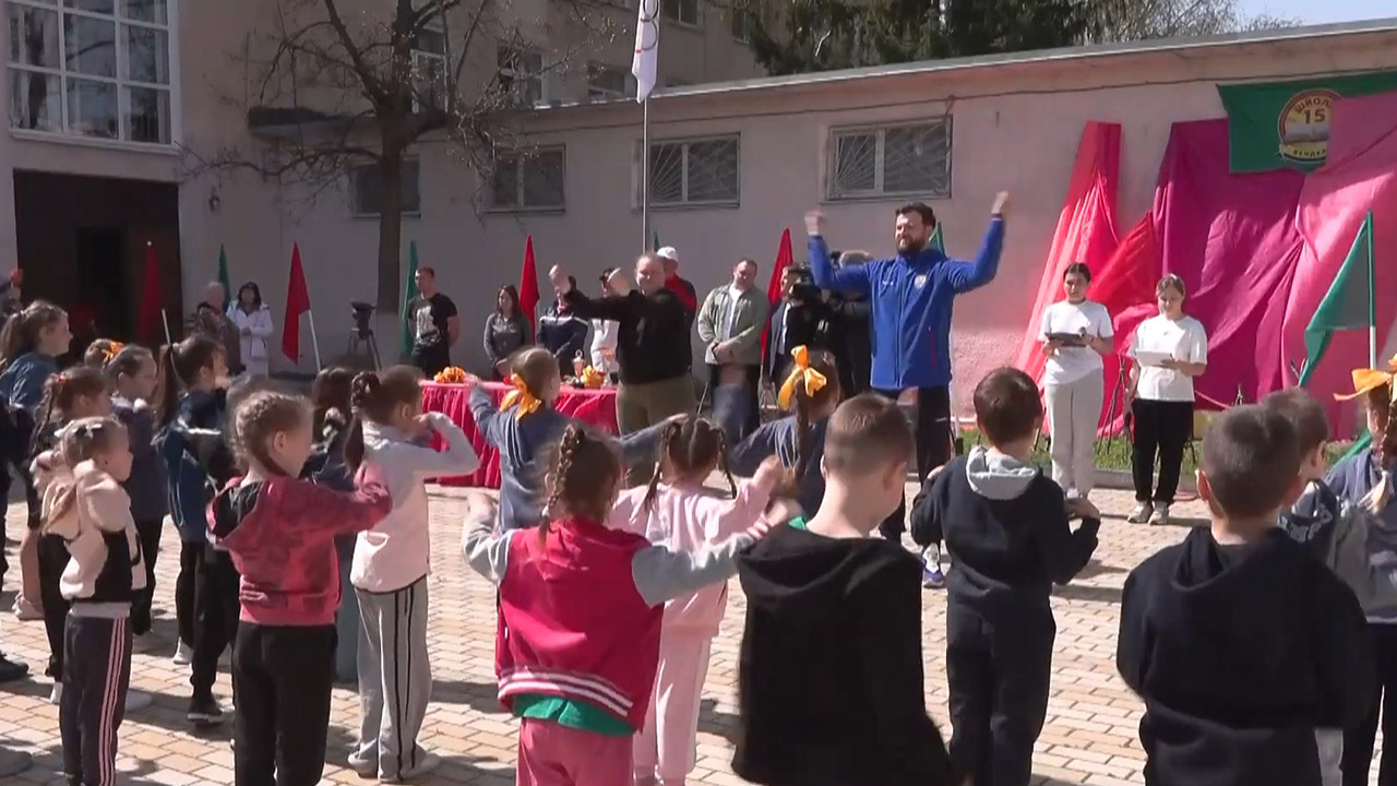На его открытии прошла зарядка с чемпионами. В гости к учащимся приехали копьеметатель из сборной России Николай Орлов и чемпионка Европы по боксу Дарья Сазонова.