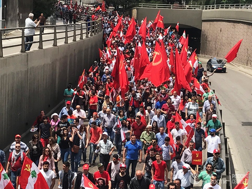 Ливанские граждане с красными знаменами и коммунистической символикой в сопровождении патриотической музыки и лозунгов традиционно прошли от улицы Корниш-эль-Мазраа (рядом с посольством РФ) до центра города Рияд-ас-Солх.