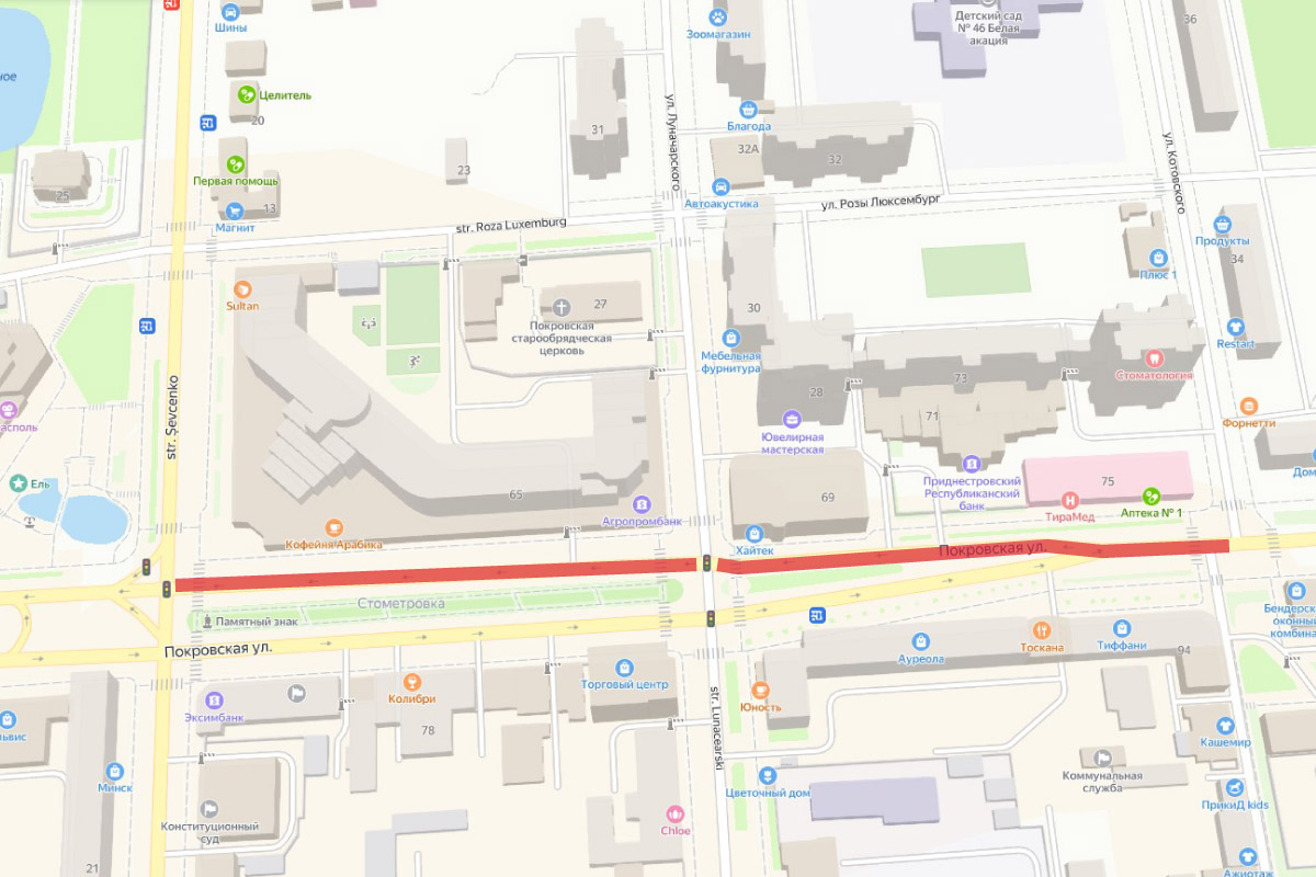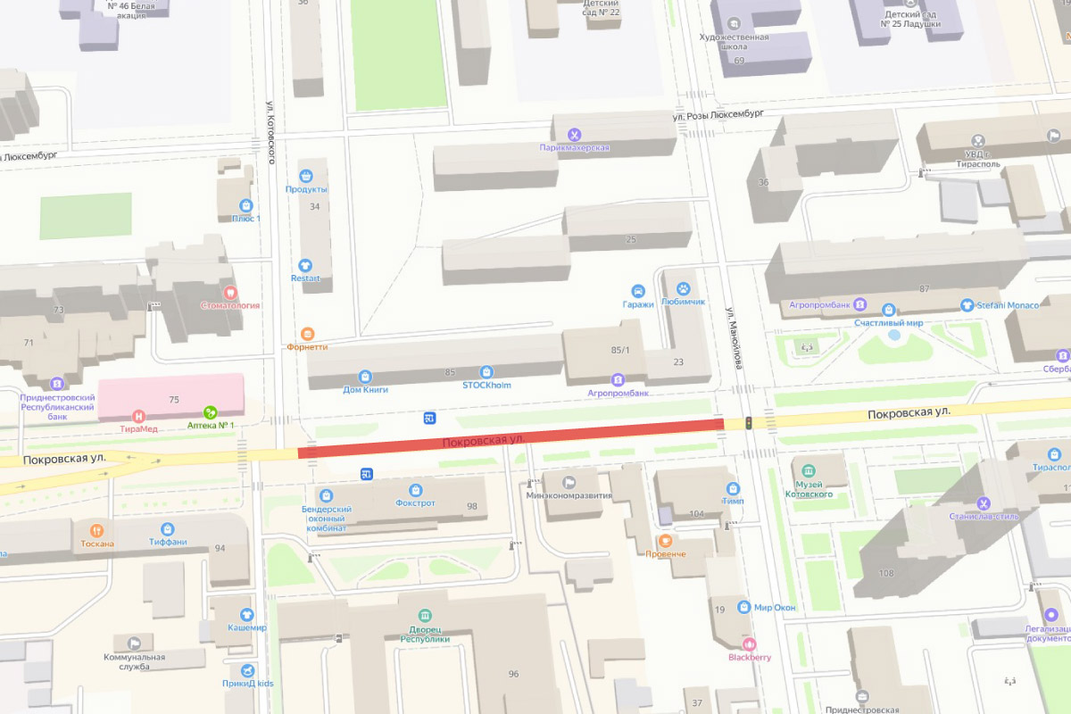 Тирасполь, 30 мая. /Новости Приднестровья/. Как сообщил официальный сайт госадминистрации Тирасполя, движение по улице Покровской от улицы Манойлова и до улицы Котовского будет частично перекрыто до 5 июня.