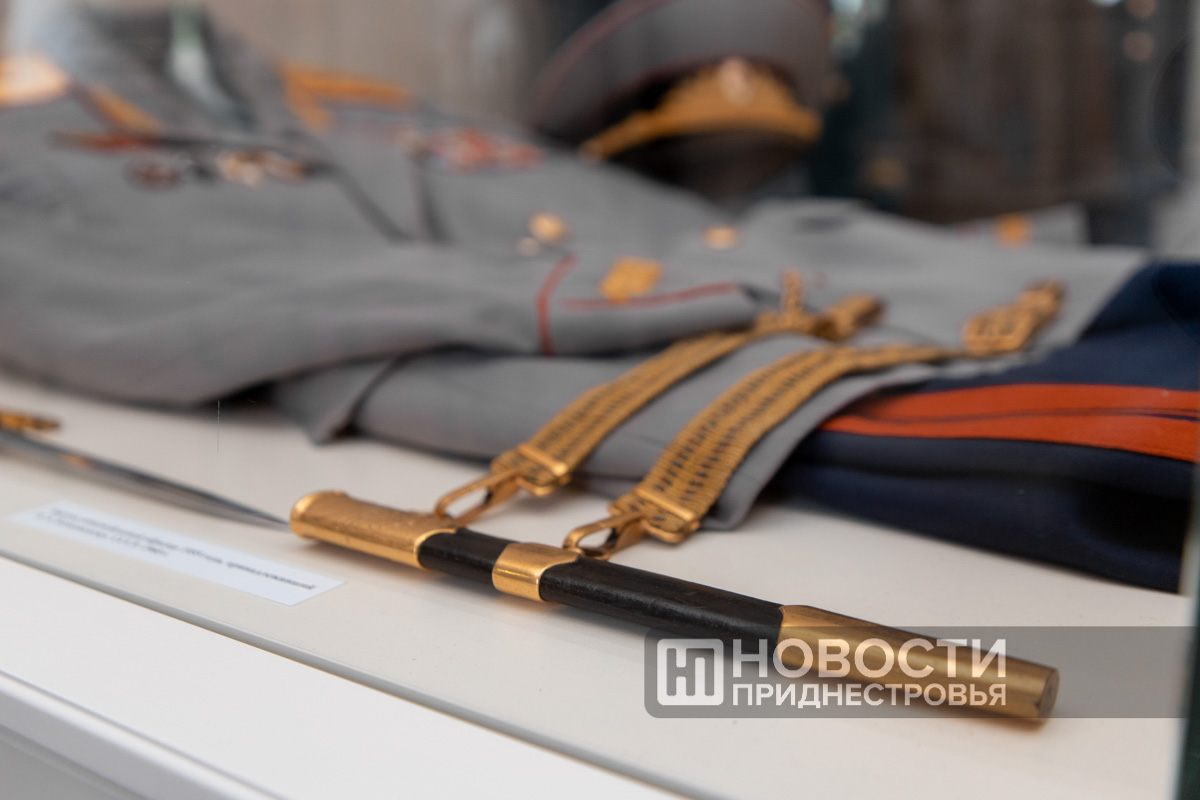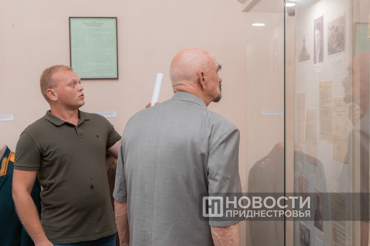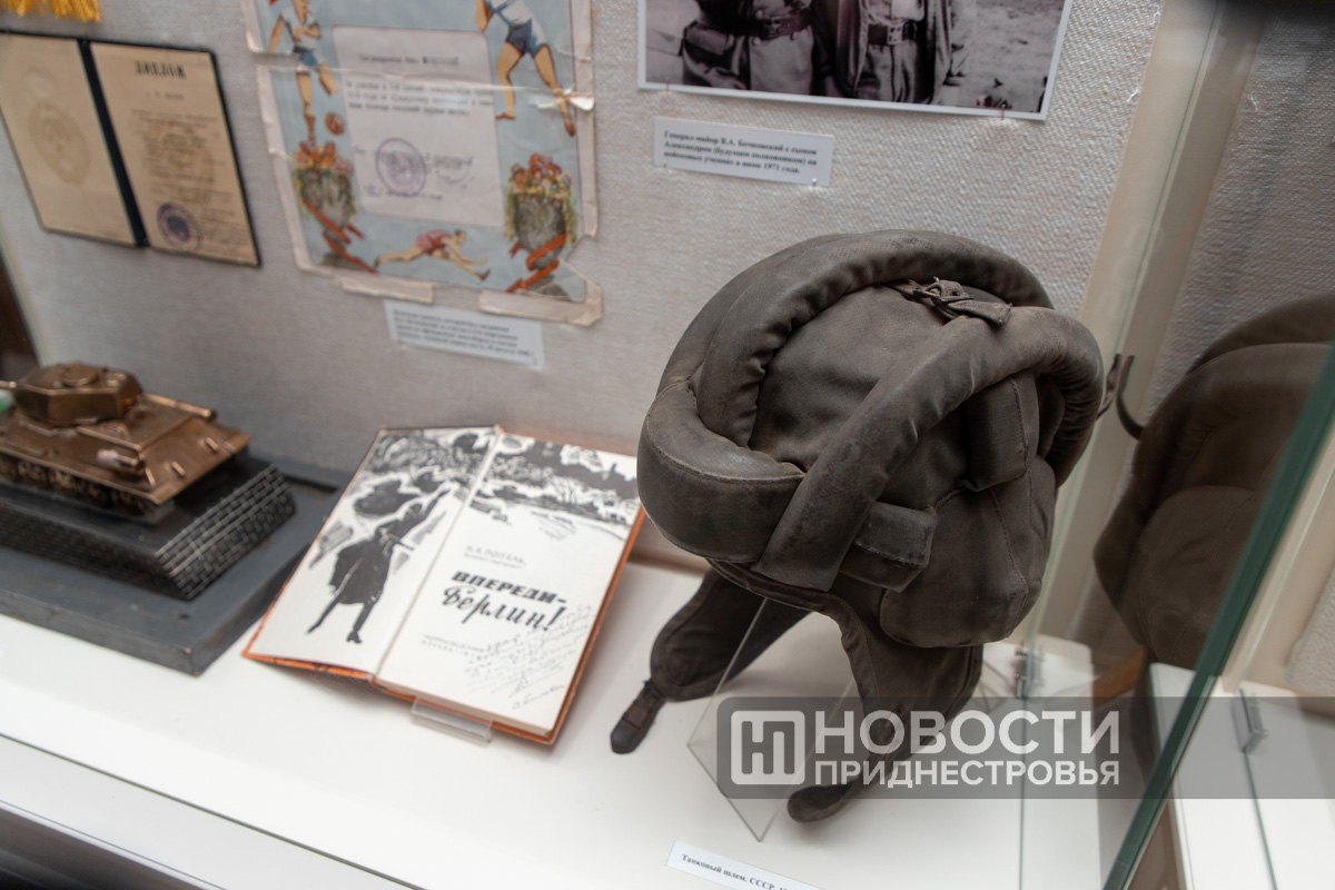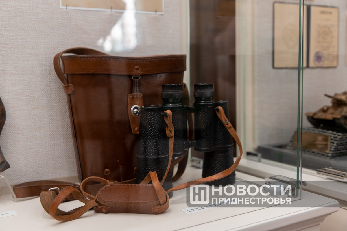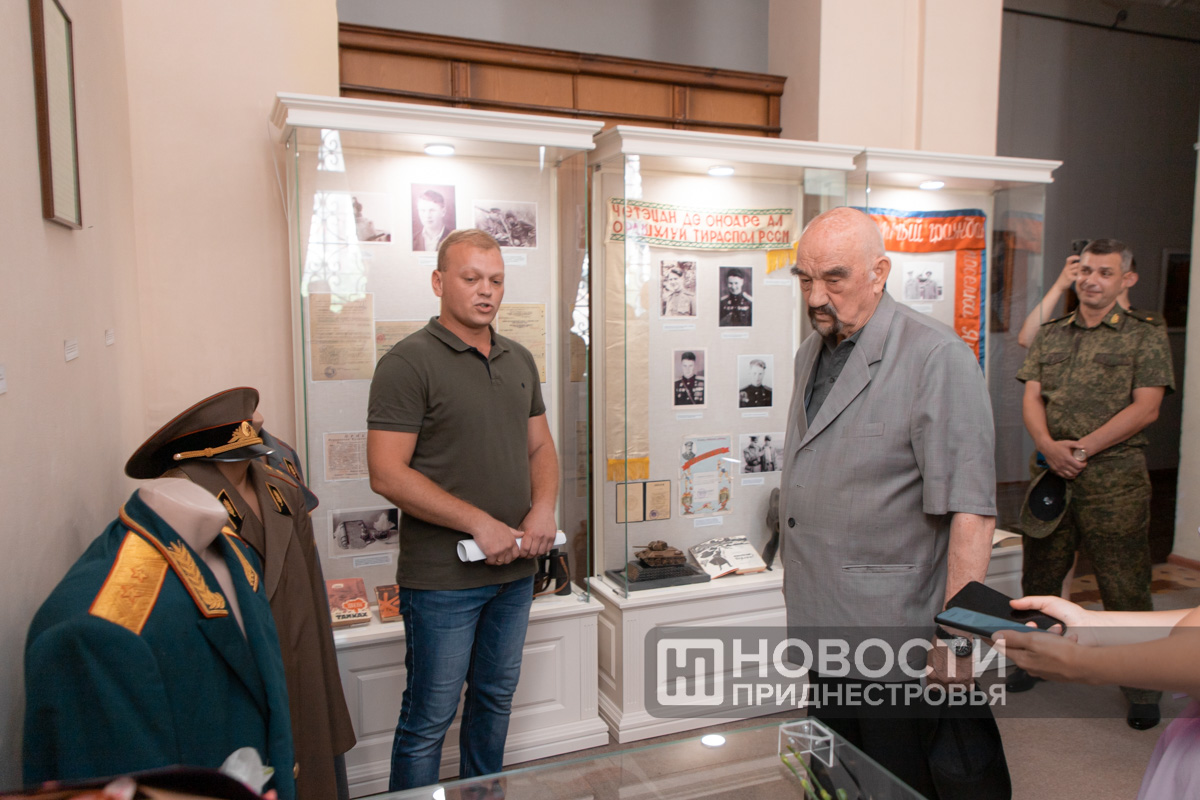 «Посмотрите на парадную униформу, ту, которая внутри витрины. На мундире, помимо наград и знаков отличия, есть нашивки о ранениях. 3 золотые нашивки – это 3 тяжёлых ранения, 2 красные это лёгкие. Он же 5 раз горел в танке. Рядом с парадной формой его кортик, личное оружие», – рассказал научный сотрудник Тираспольского объединённого музея Владимир Майер.