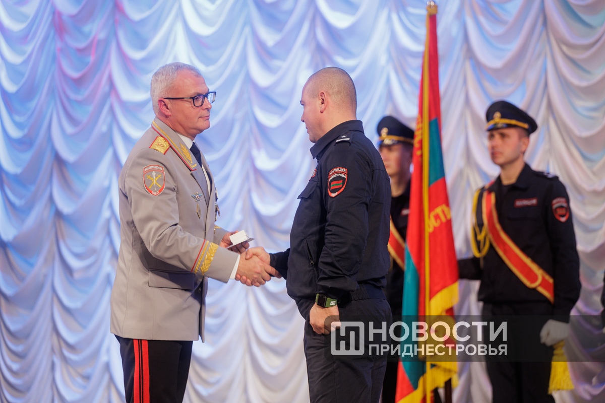Тирасполь, 10 ноября. /Новости Приднестровья/. Сотрудников и ветеранов органов внутренних дел сегодня поздравили с профессиональным праздником — Днём милиции. В их честь состоялось торжественное собрание во Дворце Республики в Тирасполе, где лучшим из лучших вручили государственные награды, а ряду сотрудников присвоили внеочередные и специальные звания.