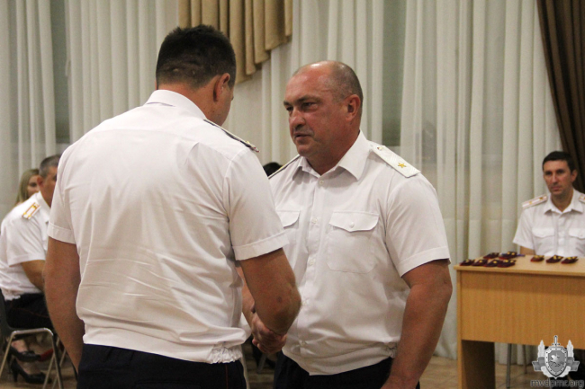 Он поздравил сотрудников ведомства с предстоящим праздником, особо отличившимся вручил государственные и ведомственные награды. Среди них – начальник Тираспольского юридического института им. М.И. Кутузова Иван Майдановский. 15 июля в акватории Кучурганского водохранилища он спас из воды тонувшего гражданина. Майор милиции был награждён медалью «За спасение утопающего».