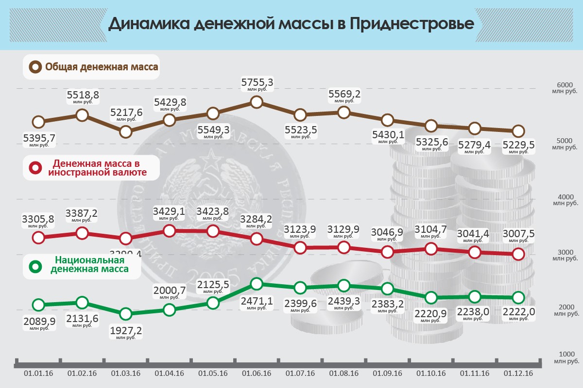Отмечается также, что объём денежной массы, номинированной в иностранной валюте, сократился на 6,8% до 2 802,1 млн рублей. Размер рублёвой денежной базы возрос на 22,1%, составив на 1 января 2017 года 2 119,7 млн рублей.