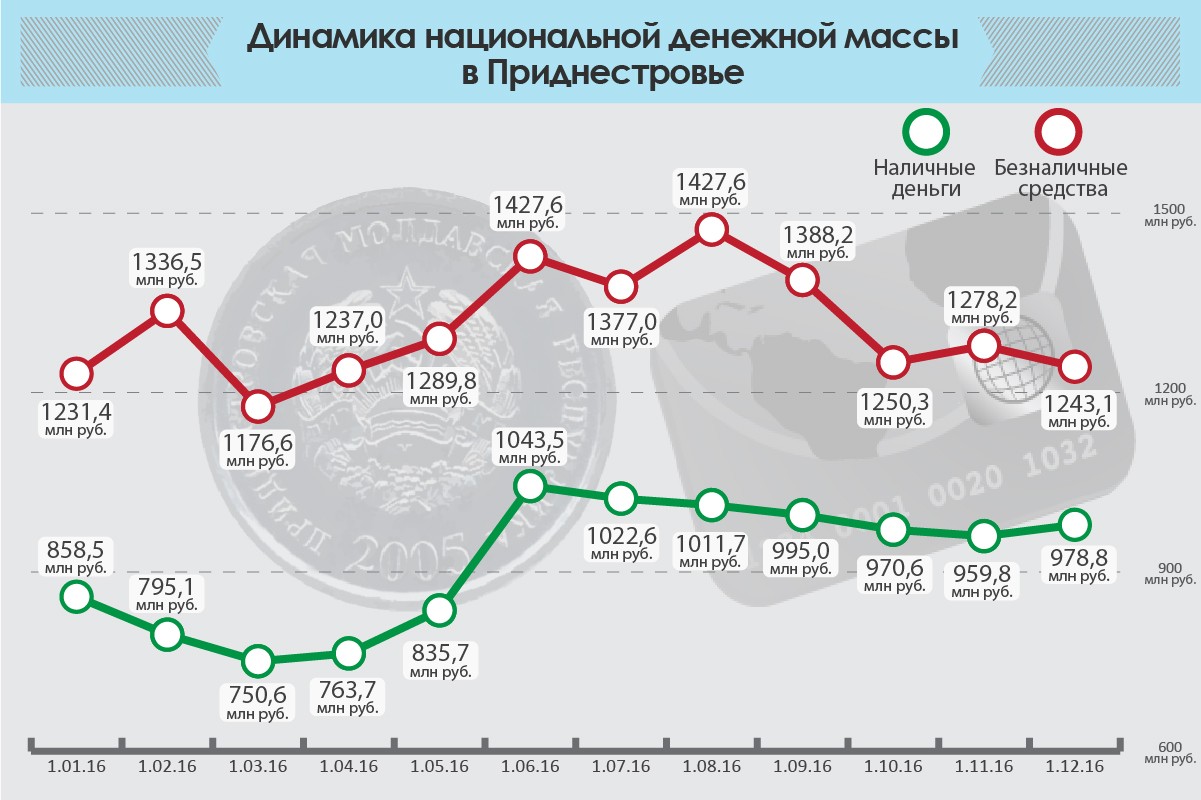11 Янв.., 2017, 17:51Тирасполь, 11 января./ИА «Новости Приднестровья"/. Национальная денежная масса в декабре 2016 года расширилась на 13,4% до 2 518,8 млн рублей, сообщает отдел общественных коммуникаций Цетробанка.
