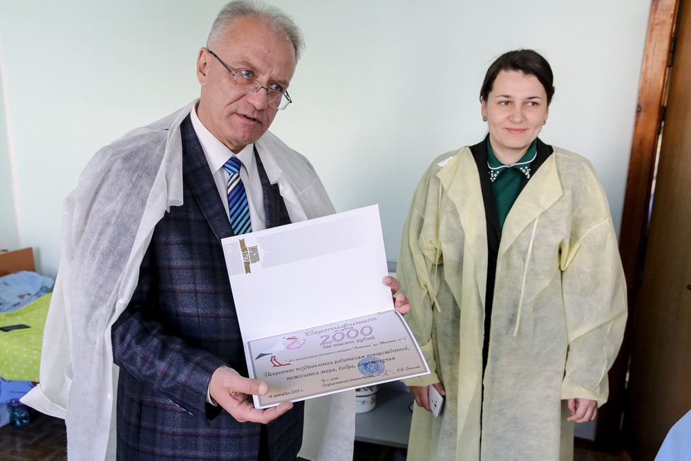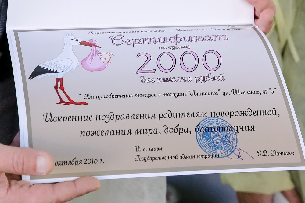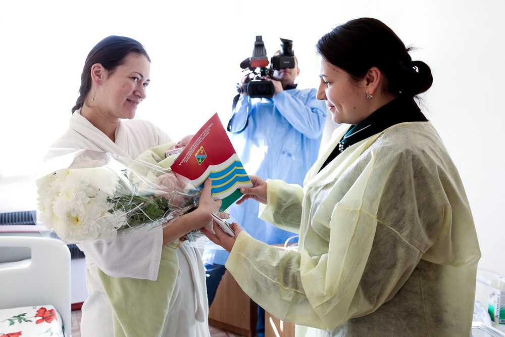 По традиции с долгожданным событием мам поздравляли городские власти. Каждой из них и.о. главы города Сергей Данилюк вручил букет и памятную грамоту. Входил в подарочный набор и сертификат на товары в магазине детских вещей, чтобы каждая семья сама выбрала необходимые вещи и принадлежности для малыша.