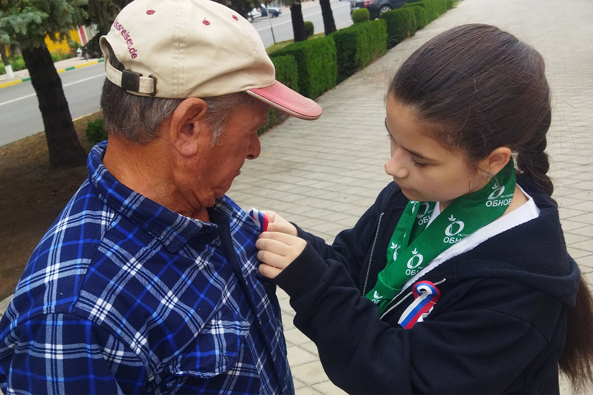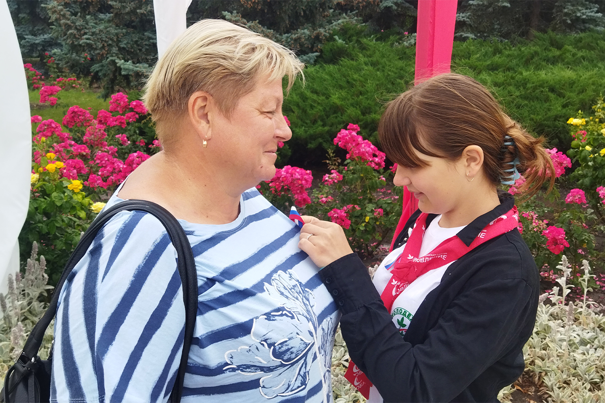 Взрослым волонтёры напомнили о Дне России, раздавая ленточки-триколоры на улицах города.