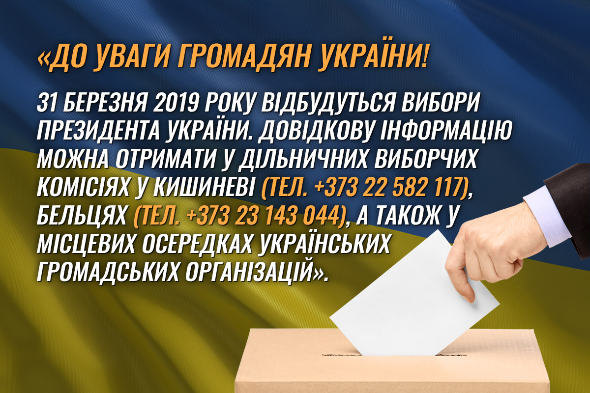 31 березня 2019 року вiдбудуться вибори Президента України. Довiдкову iнформацiю можна отримати у дiльничних виборчих комiсiях у Кишиневi (тел. +373 22 582 117), Бельцях (тел. +373 23 143 044), а також у мiсцевих осередках українських громадських органiзацiй».