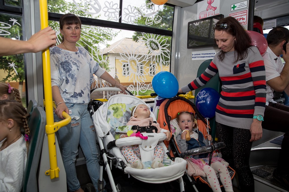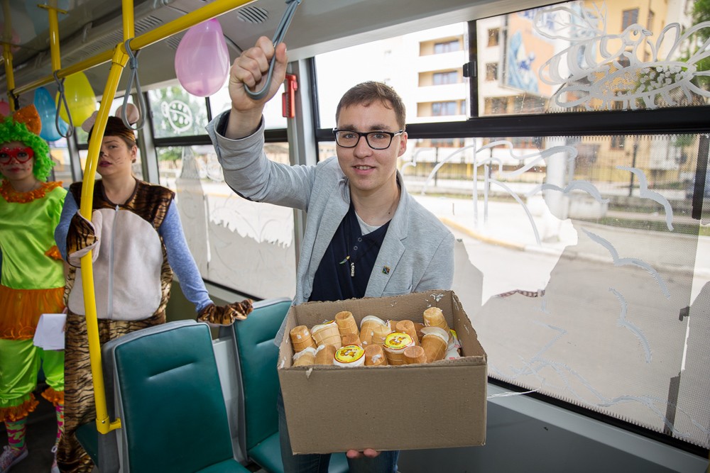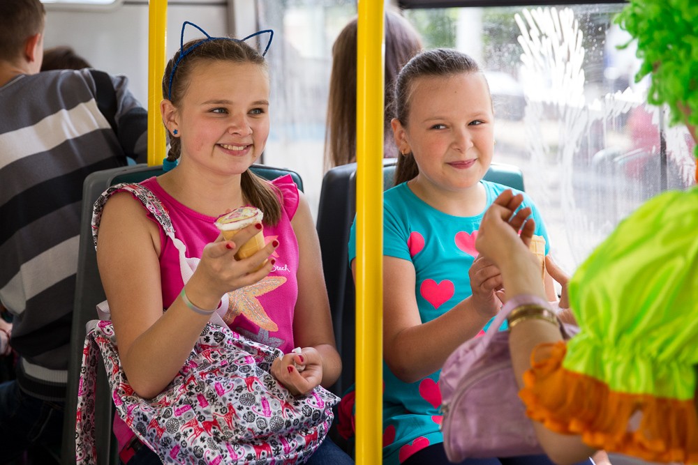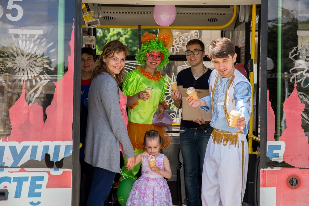 Главными пассажирами чудо-троллейбуса стали, конечно, дети. Каждому из них артисты Дворца детско-юношеского творчества вручили мороженое и поздравили с праздником.