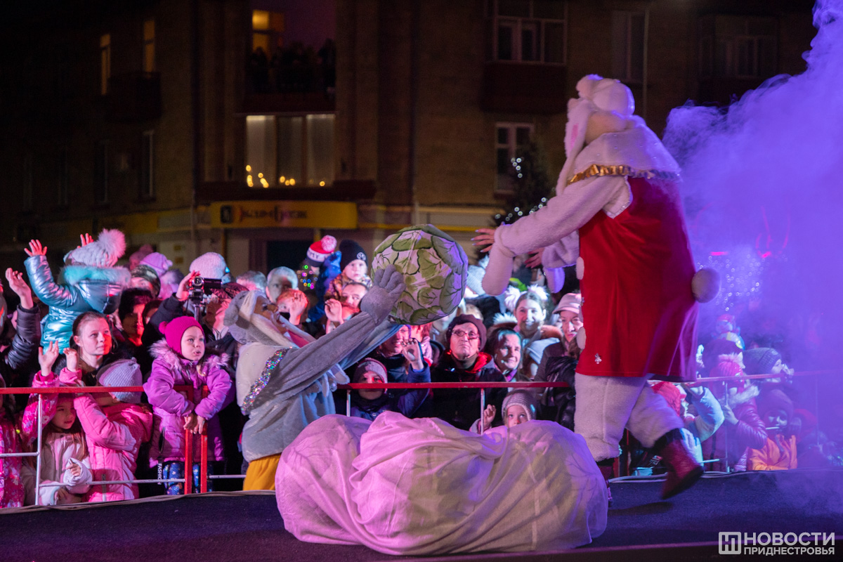 Вечером началось новогоднее шоу. Бендерчане и гости города встретили Деда Мороза, который и зажёг огни на ёлке. Празднование продолжилось хороводами и дискотекой.