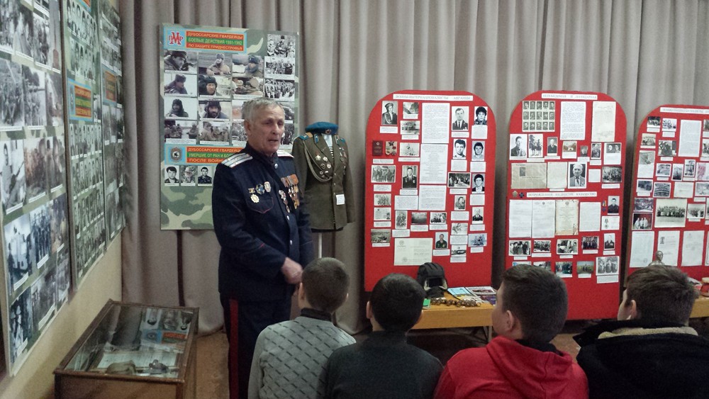 О возрождении казачества и подвигах дубоссарцев во время защиты Приднестровской Молдавской Республики школьникам рассказал сегодня войсковой старшина Дубоссарского казачьего округа, защитник Приднестровья Георгий Кожухарь. Георгий Михайлович – потомственный казак. В декабре 1991 года добровольцем записался в ряды приднестровской гвардии. Юным дубоссарцам он поведал о событиях, которые происходили в городе и районе в конце 80-х – начале 90-х годов прошлого столетия.