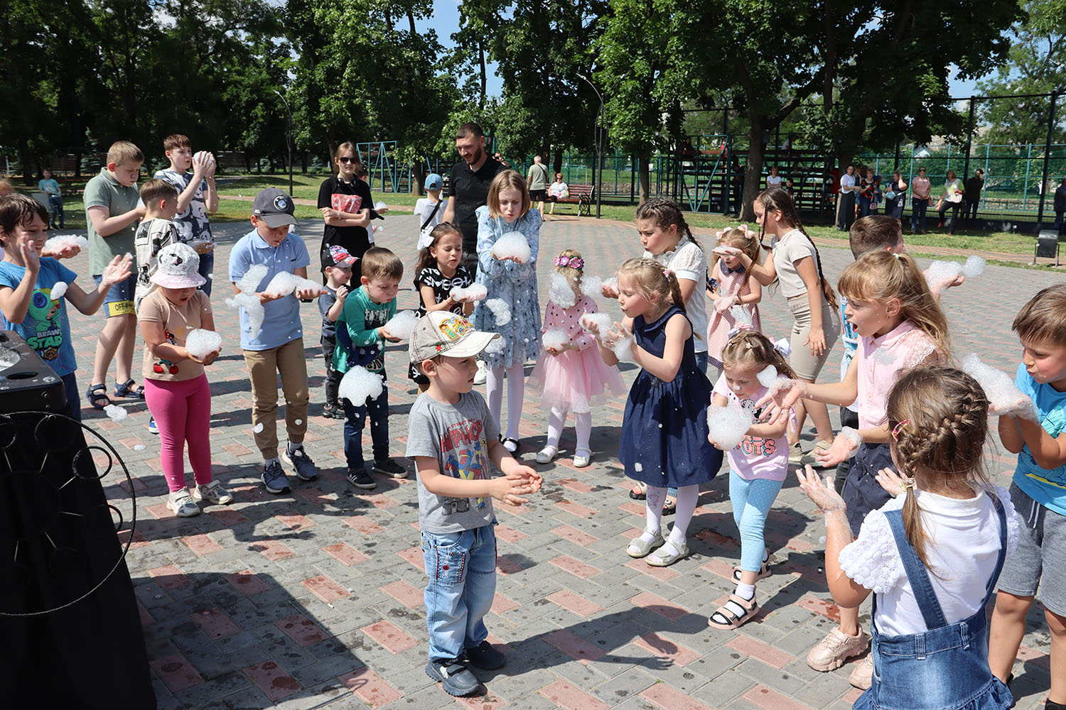 Аниматоры провели с ребятами конкурсы, игровые и развлекательные программы. Были также различные эстафеты и мыльные пузыри. Не обошлось и без традиционного лакомства – мороженого и сладких подарков.