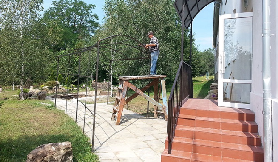 Все работы выполняют сотрудники учреждения. Уже отремонтировали крыльцо с выходом из школы, как раз к этноуголку. Также здесь установили перила и козырёк, дорожки выложили из камня, сварили арку для цветов, выкопали котлован и подготовили пространство для будущего пруда.